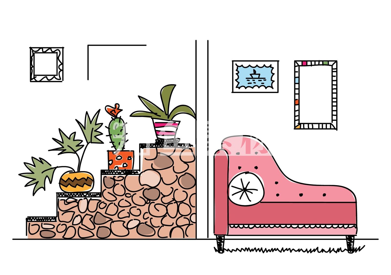 室内房间植物阶梯沙发素描首页墙纸的女孩