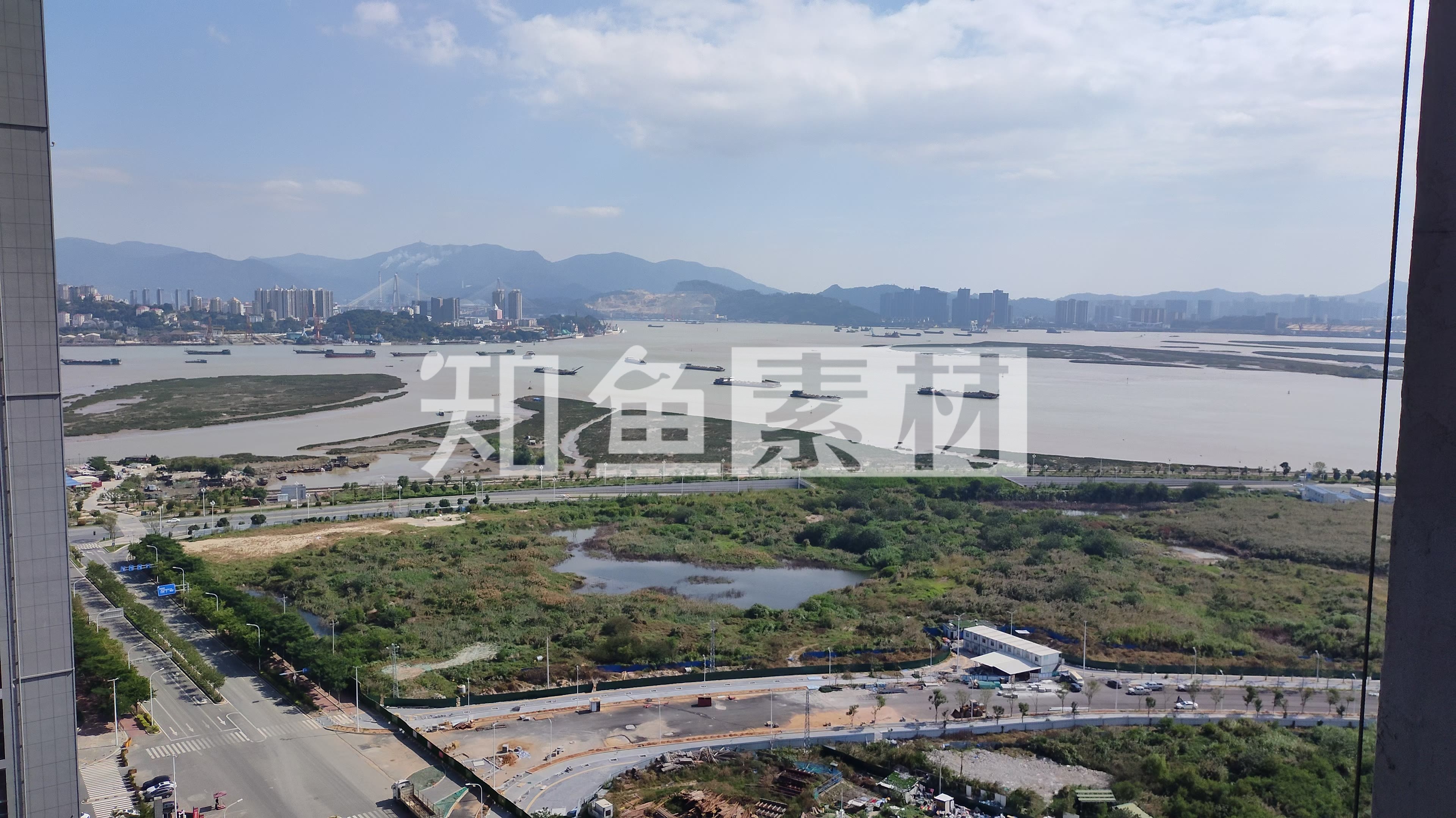 俯瞰窗外的建设和蓝天大江