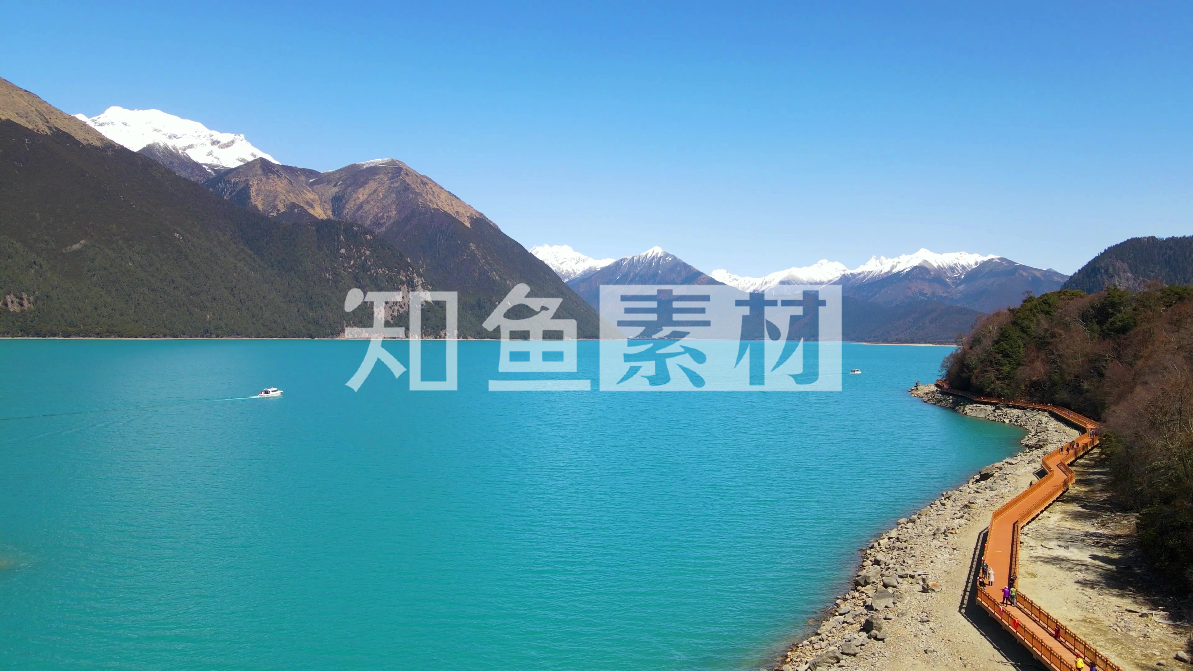 航拍西藏林芝青山蓝天下绿宝石般的巴松措湖面
