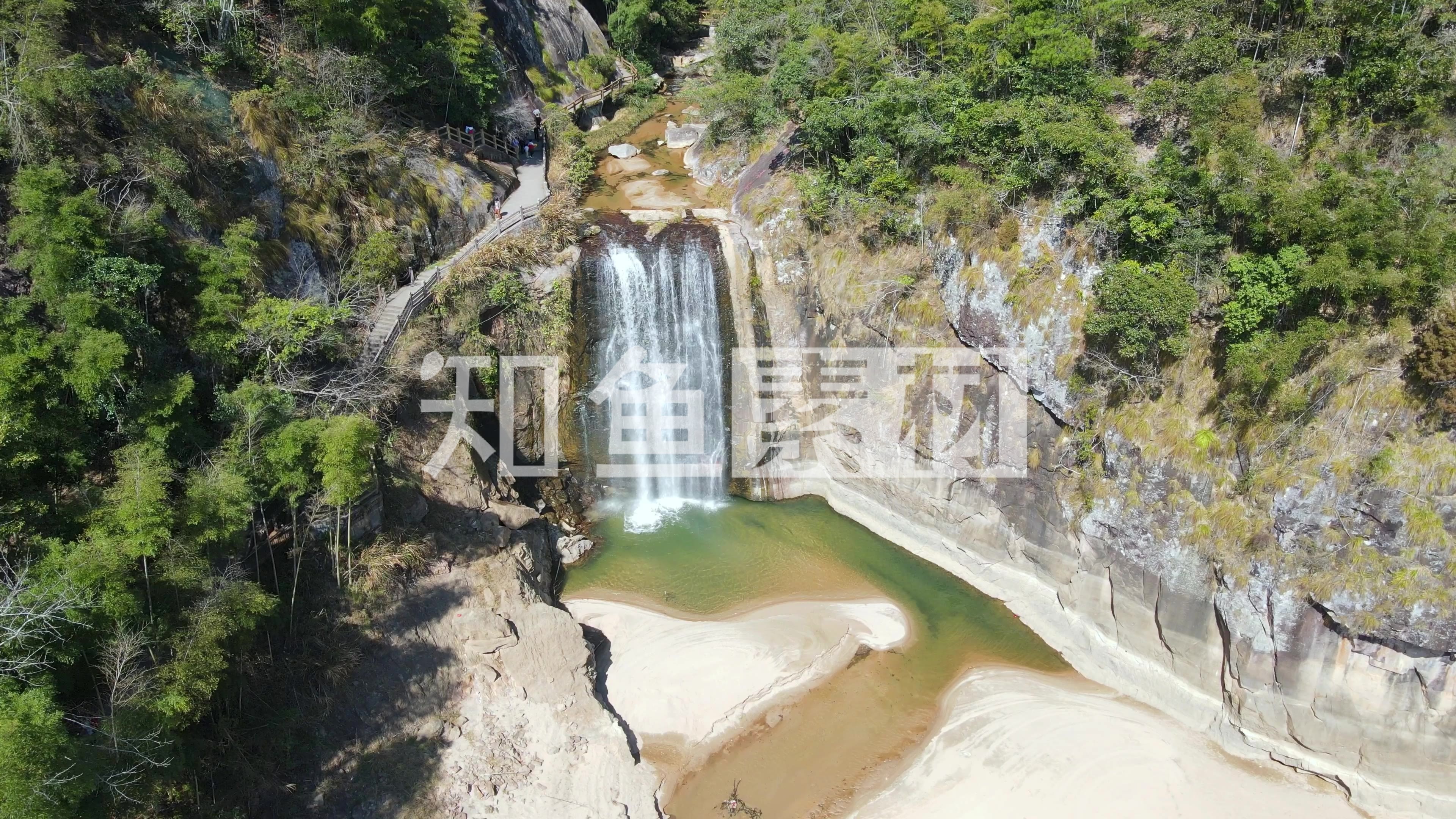 福建三明大丹霞地貌的大金湖景区,航拍慢慢接近山中的瀑布。