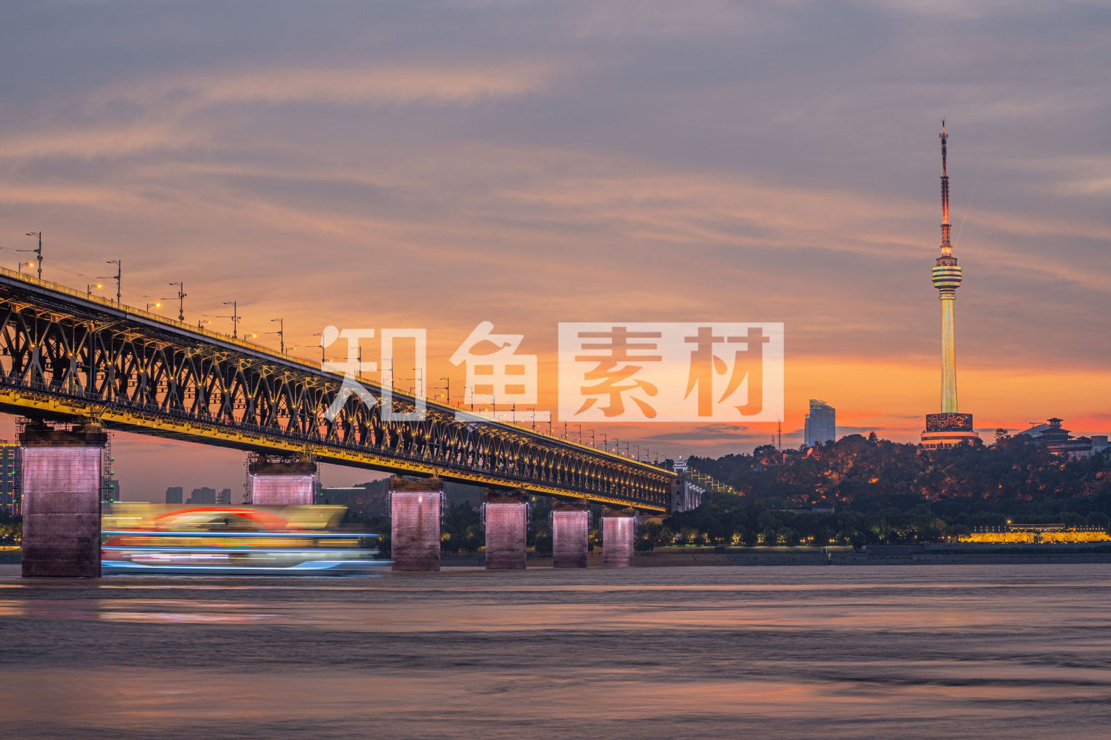 武汉长江大桥江滩龟山电视塔傍晚晚霞