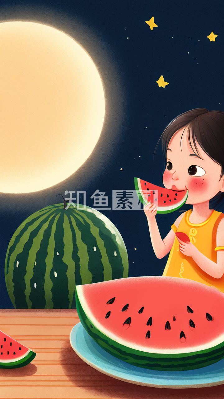 夜晚女孩吃西瓜插画