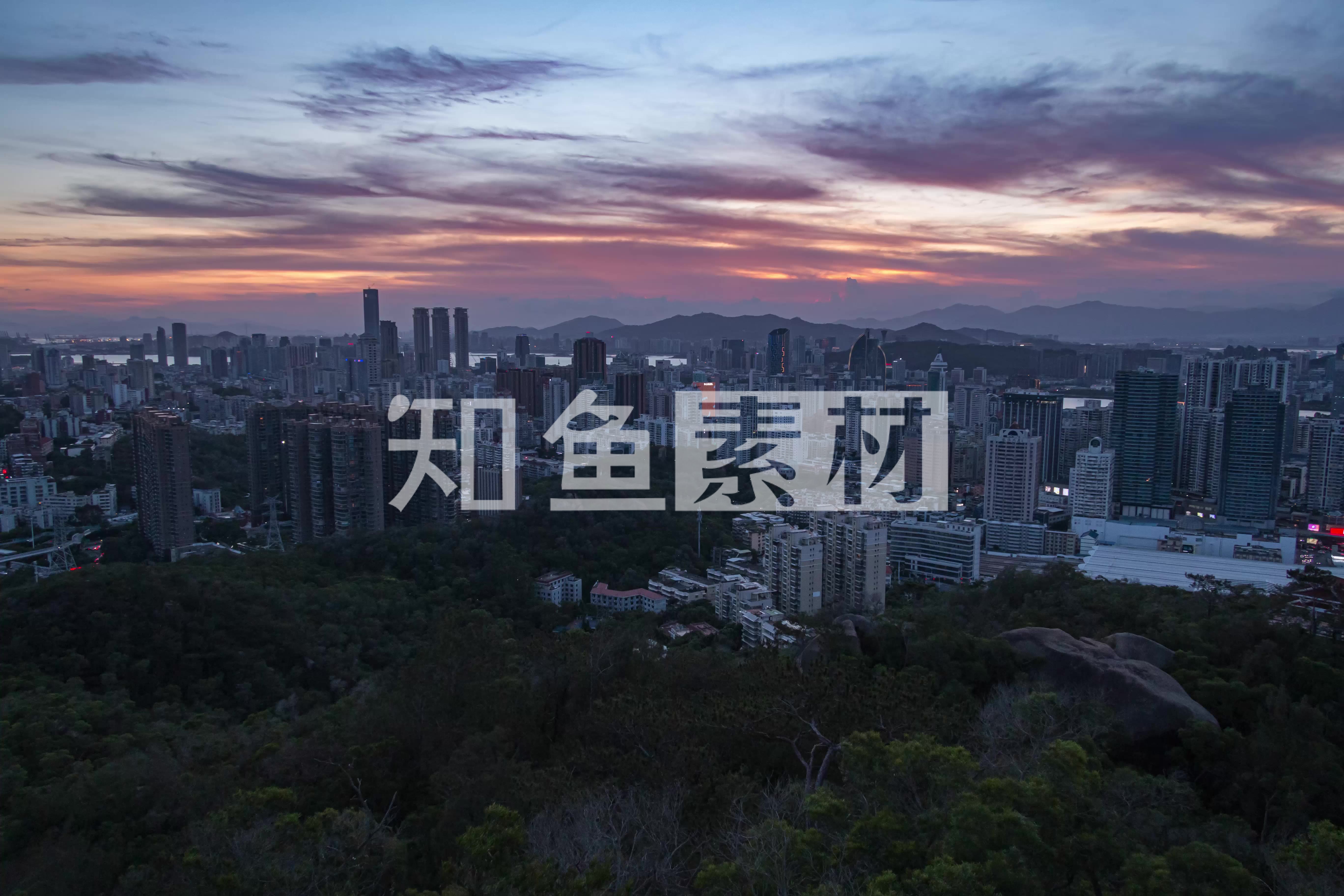 山顶鸟瞰滨海旅游城市厦门全景晚霞火烧云延时