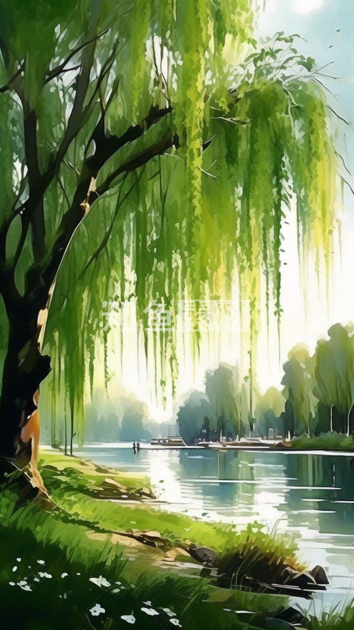 河边柳树插画风景图 12