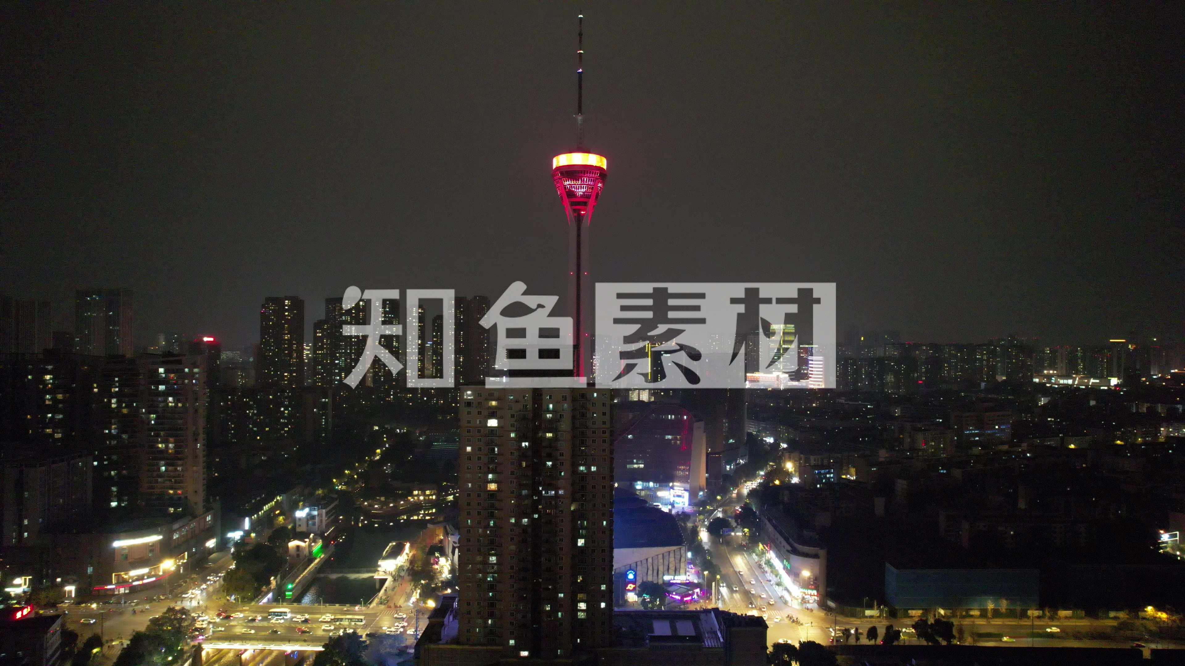 四川成都天府熊猫塔夜景灯光航拍