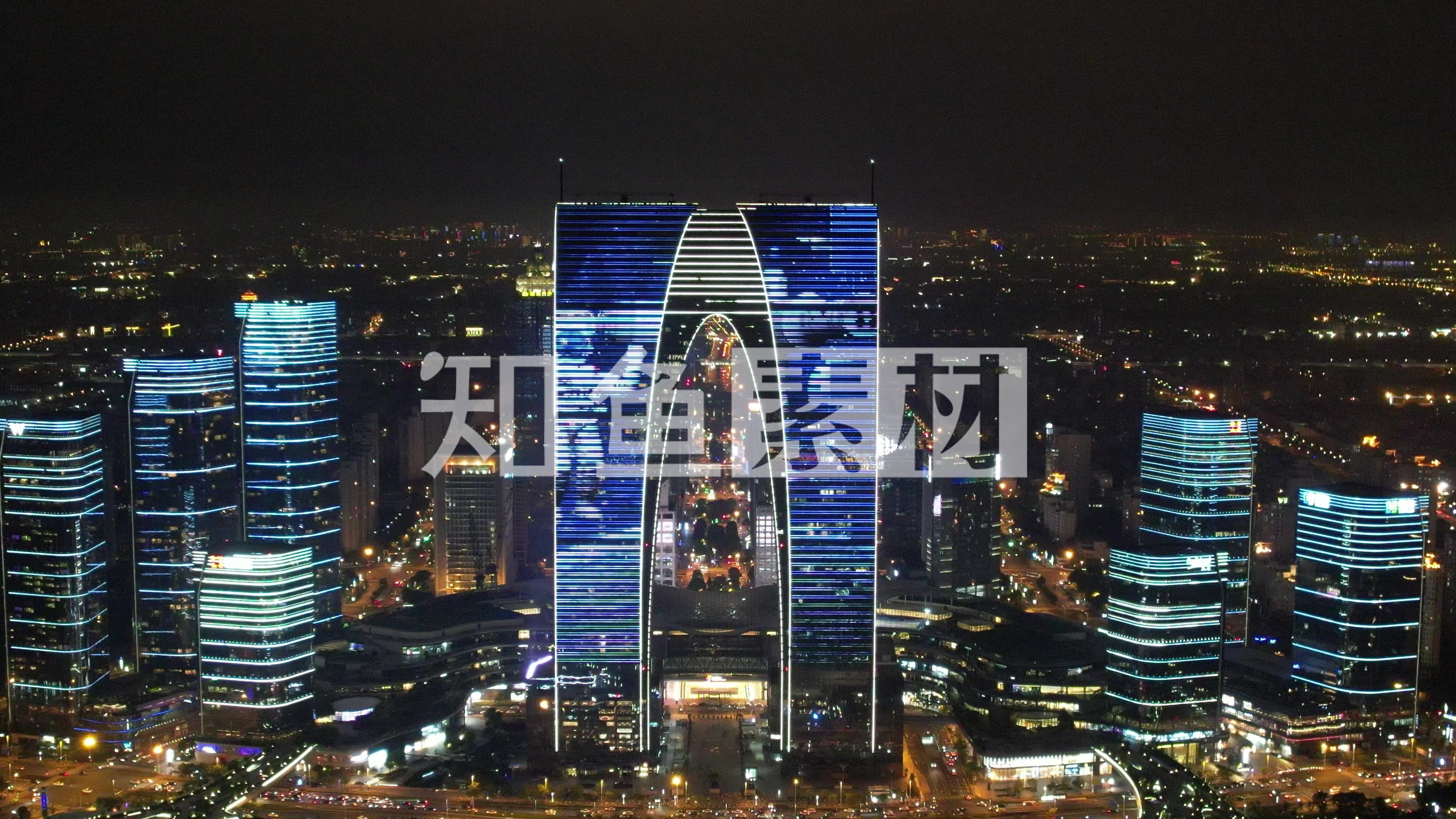 江苏苏州工业园区国金中心苏州之门夜景灯光航拍