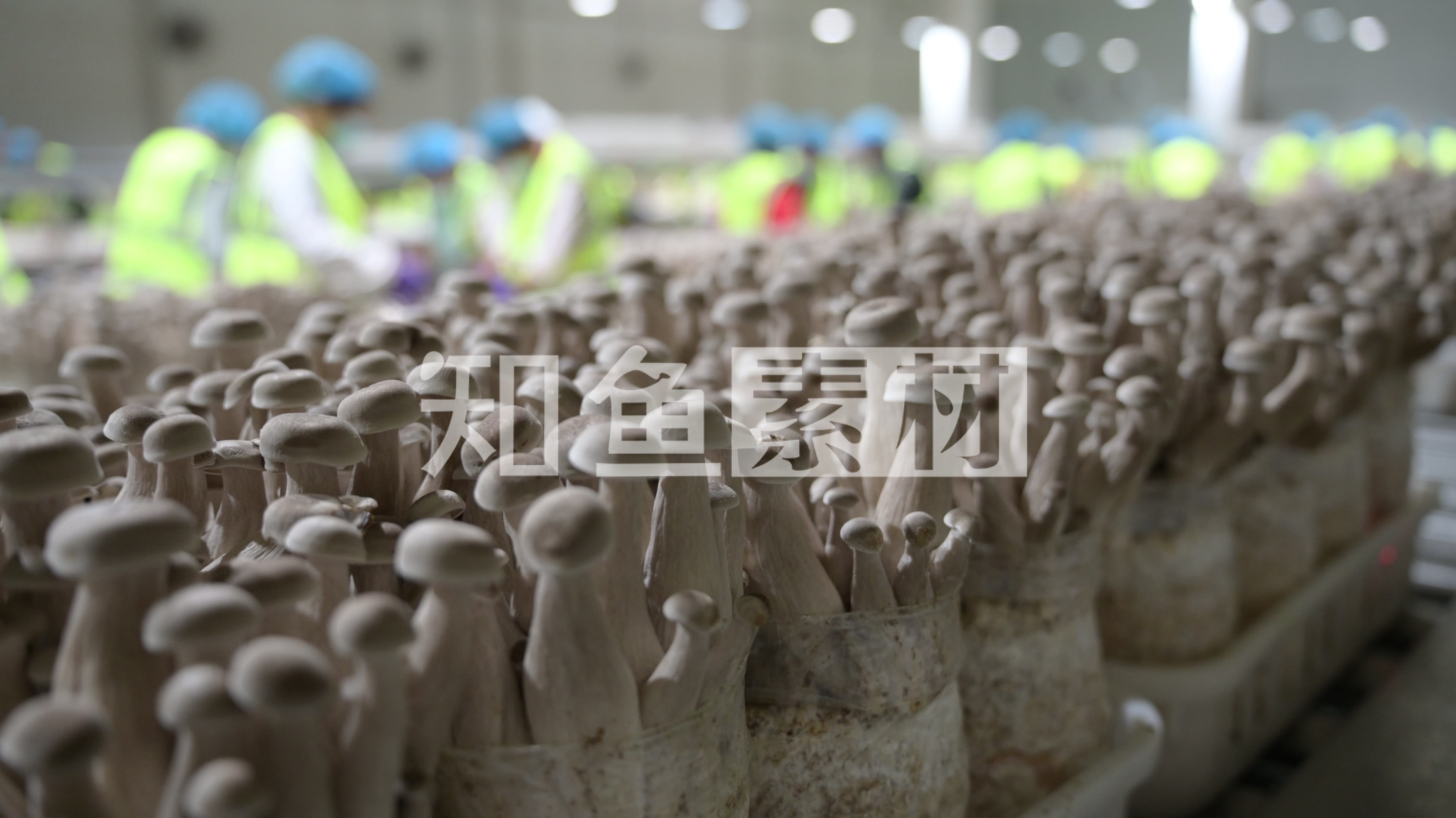 在采菇车间,一筐筐成熟的鹿茸菇通过传送带被源源不断输送到切菇车间,工人们正忙着把鹿茸菇切根、分拣、装框、称重,一派繁忙。