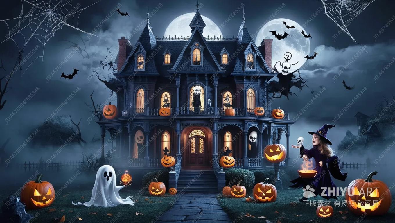 哥特式建筑风格的鬼屋在月光下显得阴森可怖,屋顶上点
