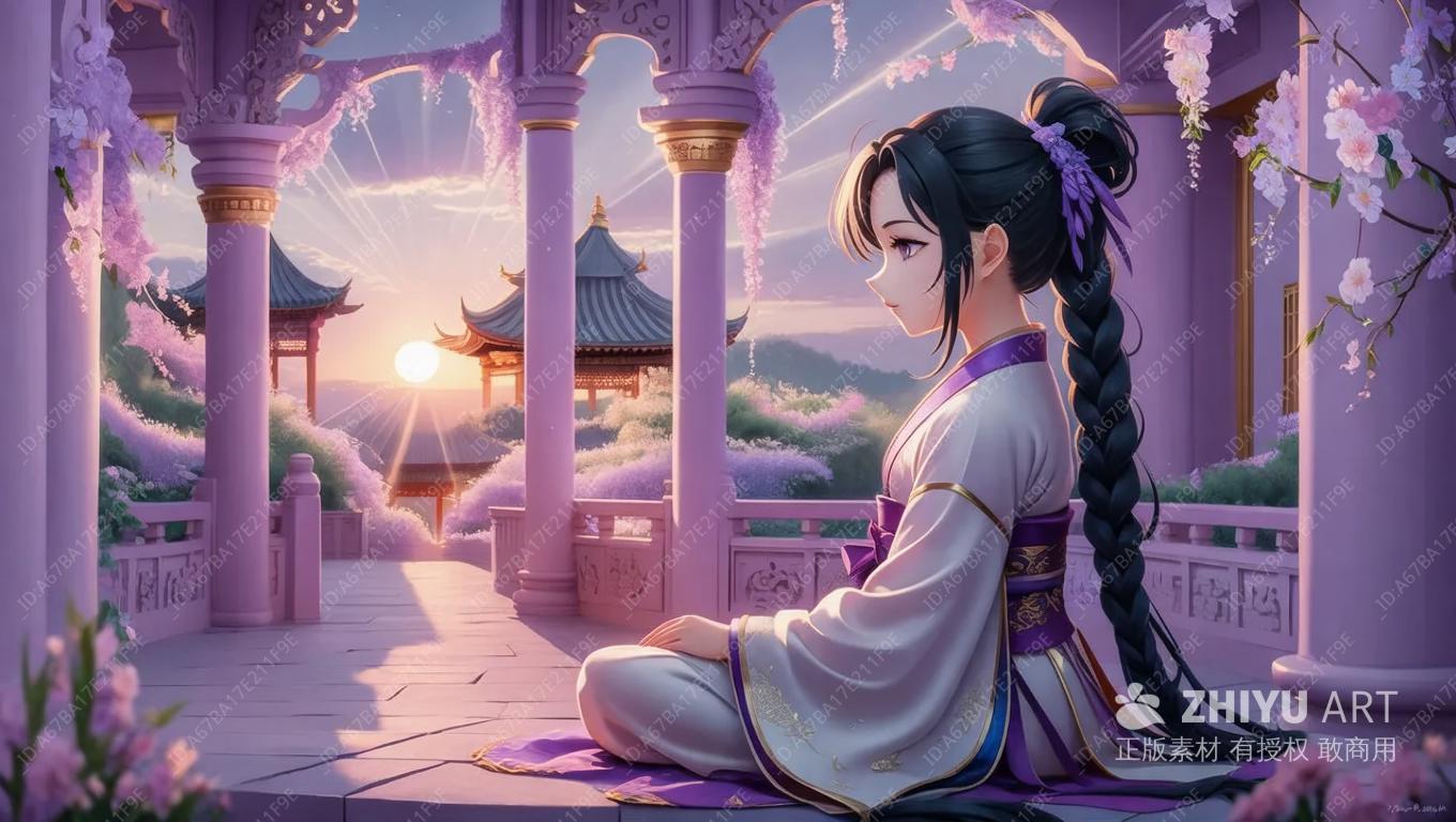 一个薰衣草色调的寺庙里,一位穿着传统服饰的黑发紫梢