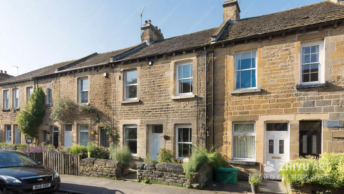 一排排房屋并肩而立,外墙由浅黄色石砖砌成。每栋房屋