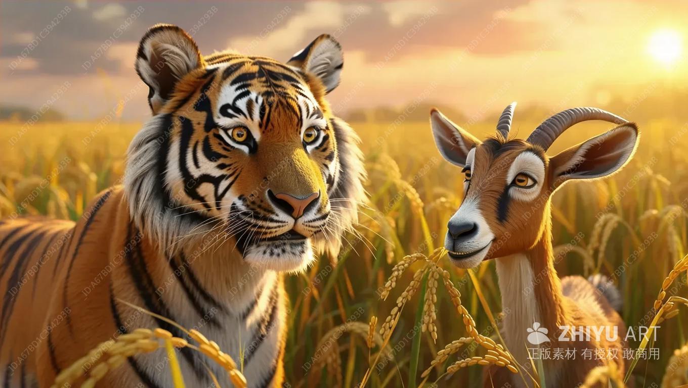 茂密的稻田里,一只威严的虎和一只好奇的山羊共存。老