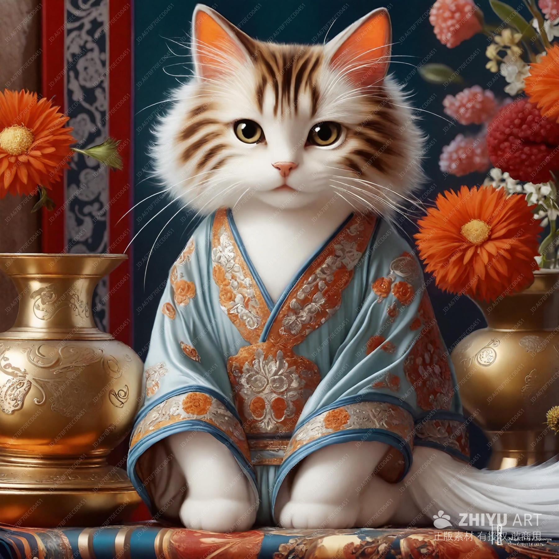 一只母猫穿着绣有花朵的蓝色服装坐在图案精美的垫子上