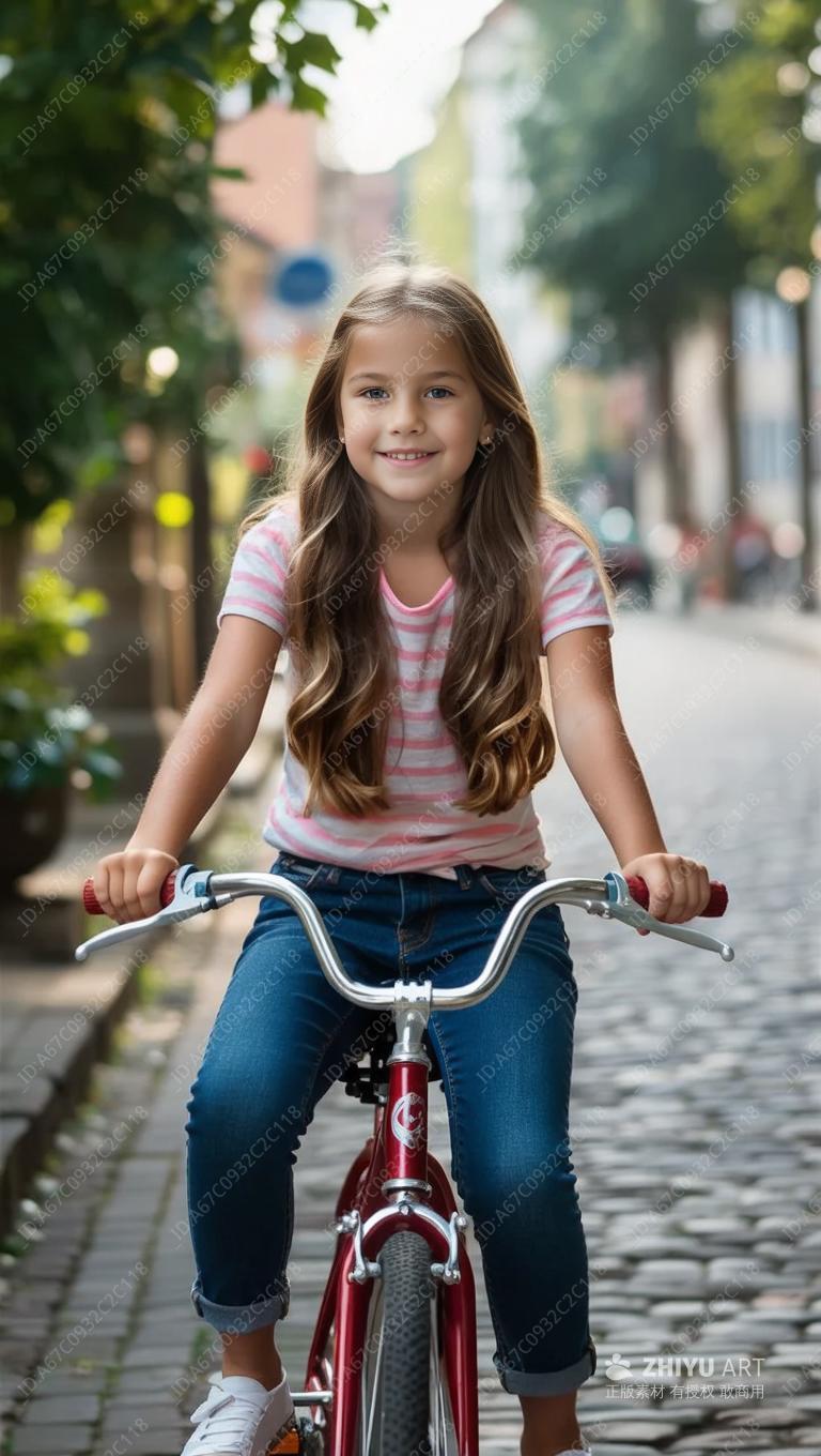 一个女孩坐在自行车上。她穿着条纹衬衫和蓝色牛仔裤,