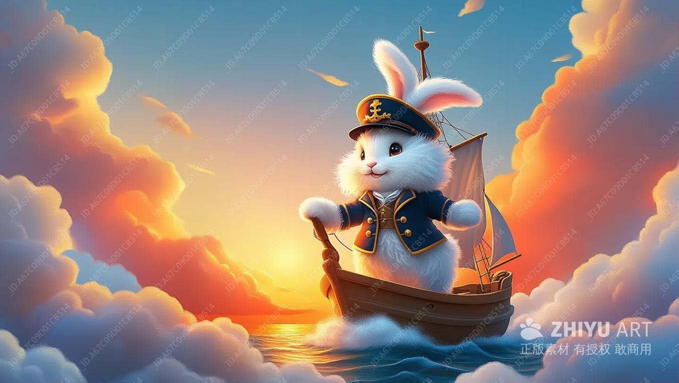 一只毛茸茸的兔子船长,头戴航海帽,自信地站在一艘奇