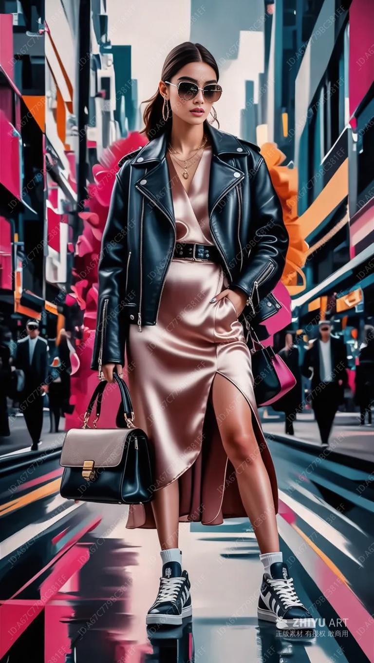 一位女士身穿黑色皮夹克,内搭香槟色丝绸连衣裙,脚穿
