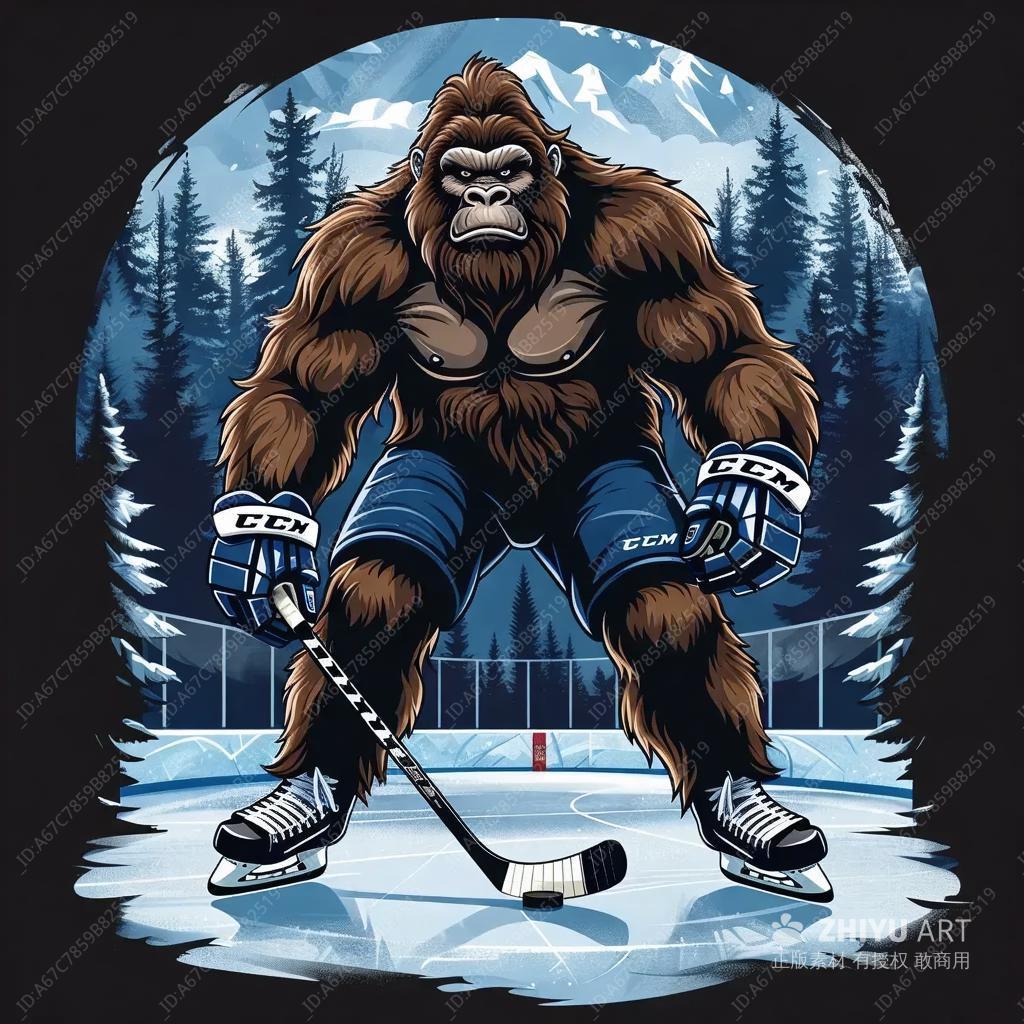 一个毛茸茸的类人生物,穿着冰球装备站在冰面上,手中