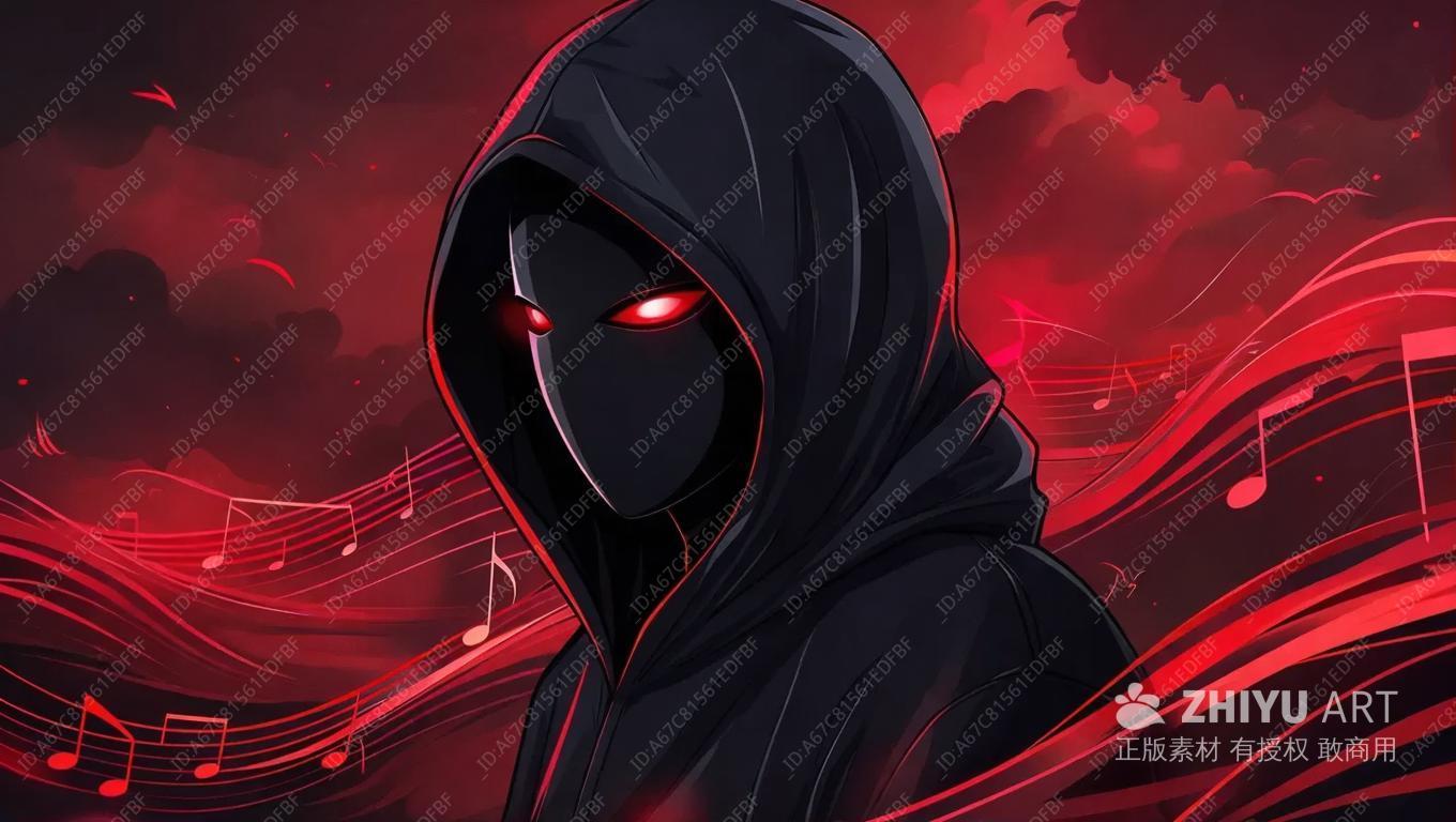 一个卡通风格的黑色兜帽人像,眼睛发出红光,没有面部