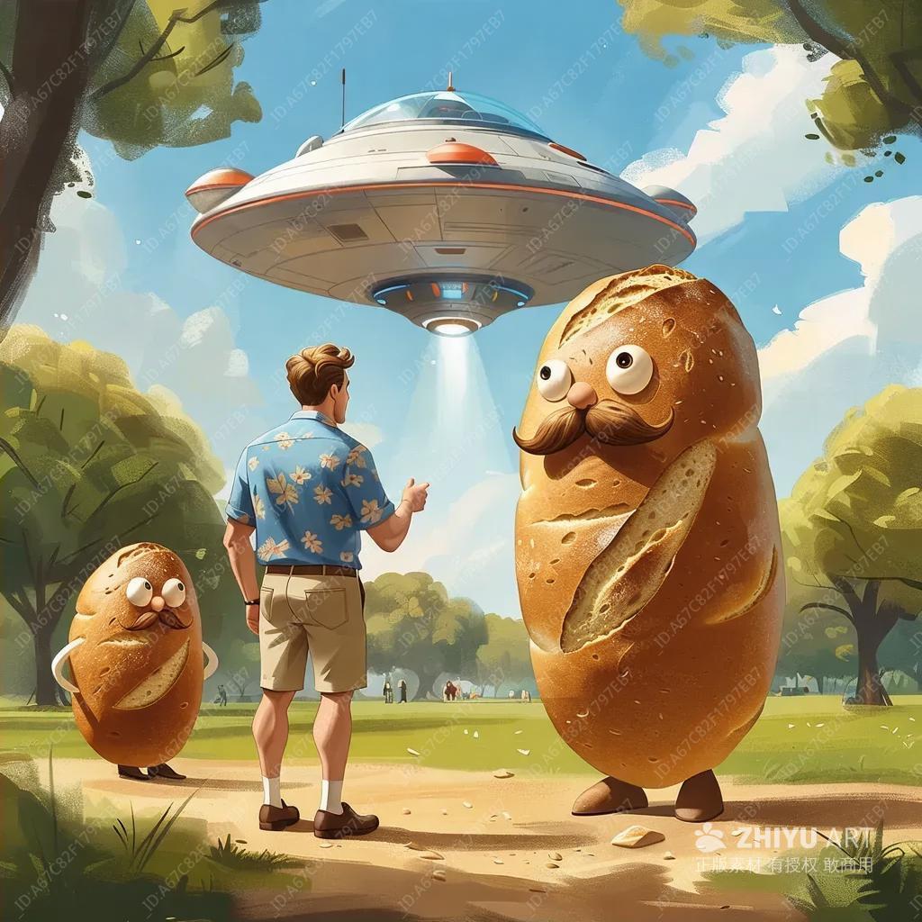 两块面包做成的人形站在公园里,它们面前有一艘舱门打