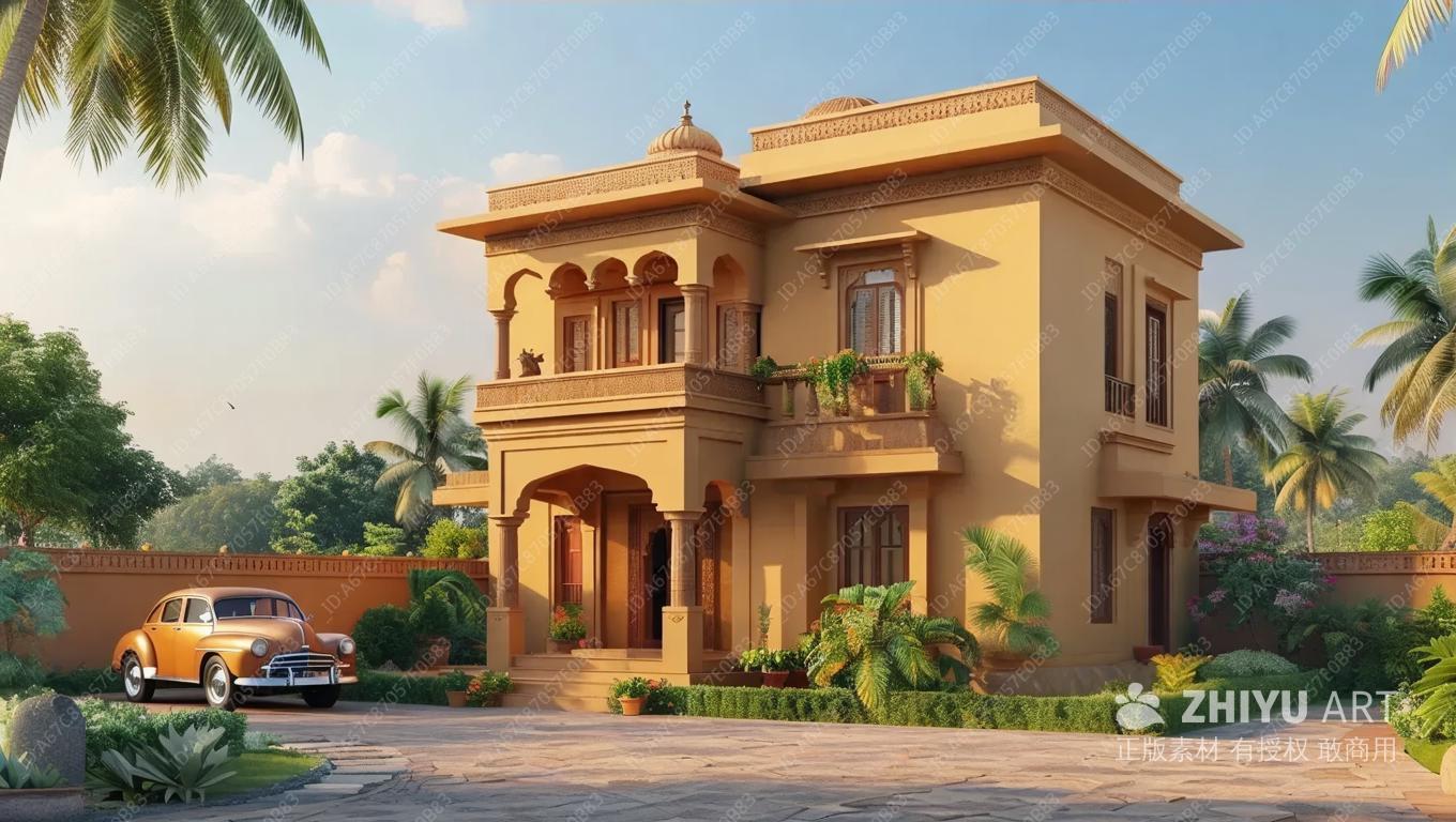 一栋两层楼房坐落于庭院中,建筑风格带有印度文化元素