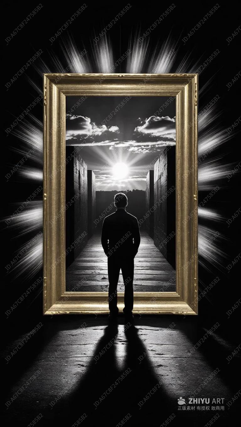 黑白图像中,一个男人站在一条黑暗走廊的尽头。他正凝
