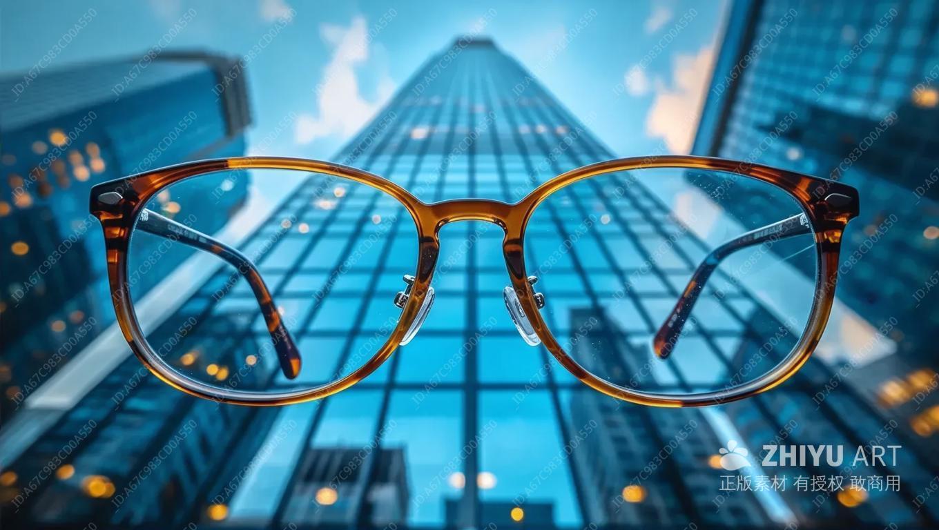 一副棕色框的眼镜位于画面中心,镜片后方是高耸入云的