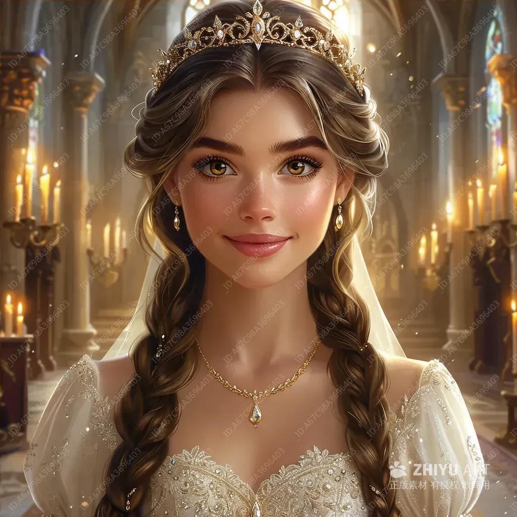 一个有着金色眼眸和棕色长发的16岁公主,身穿闪亮的