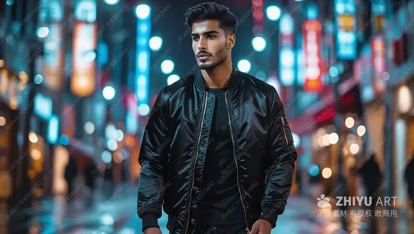 一位穿着黑色飞行员夹克的男士在夜晚的城市街道中。他