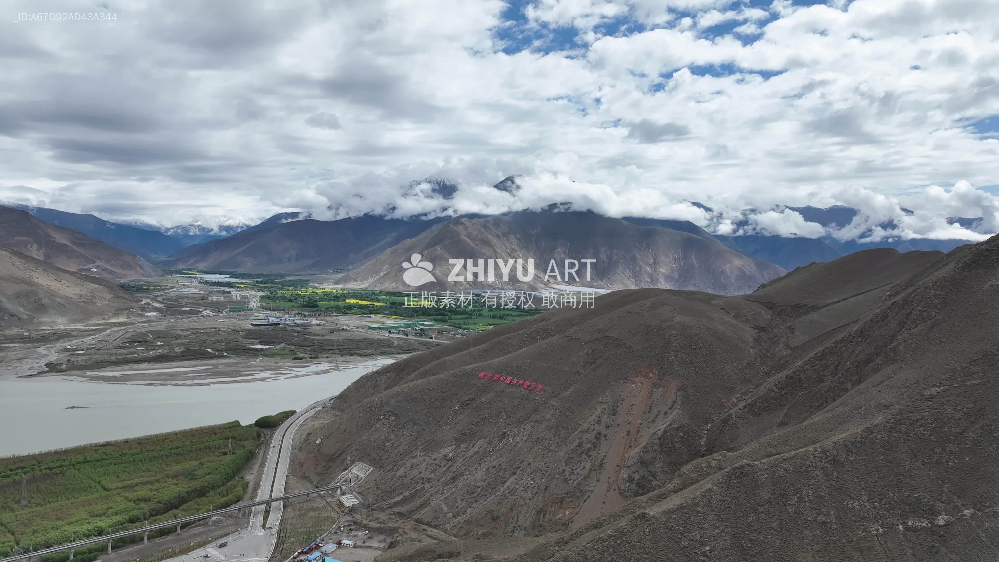 西藏 山南 祖国 航拍 大地 山河 党建 山脉 河流 云层 红色标语 村庄 自然风光 宁静 开阔 高地 山脊 山谷 荒野 山口 丘陵 山峰 山 山中避暑地 小山 自然景观