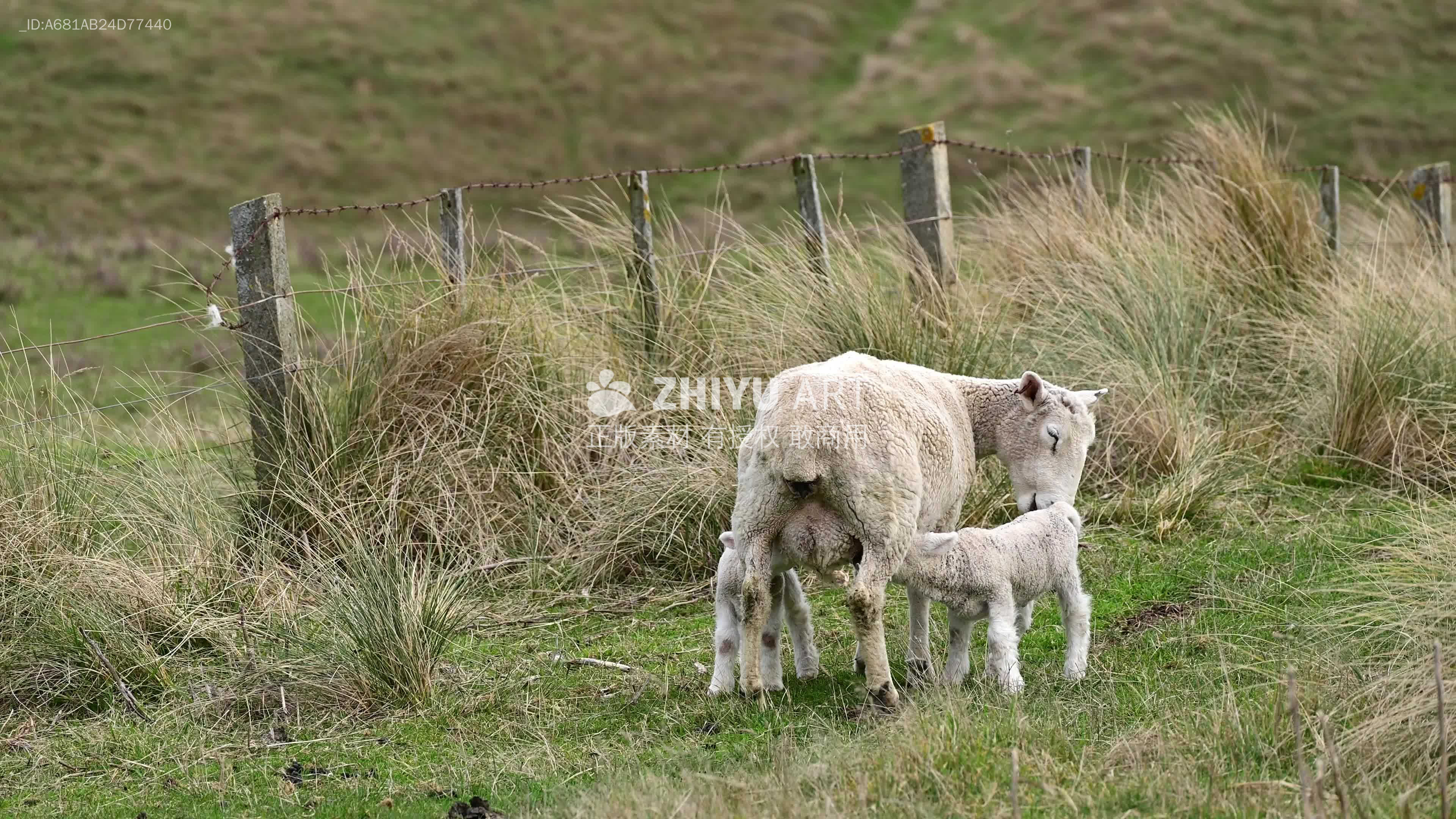 新西兰但尼丁奥塔哥半岛的sandfly bay飞沙湾海边牧场,一只绵羊带着一只小羊羔。
