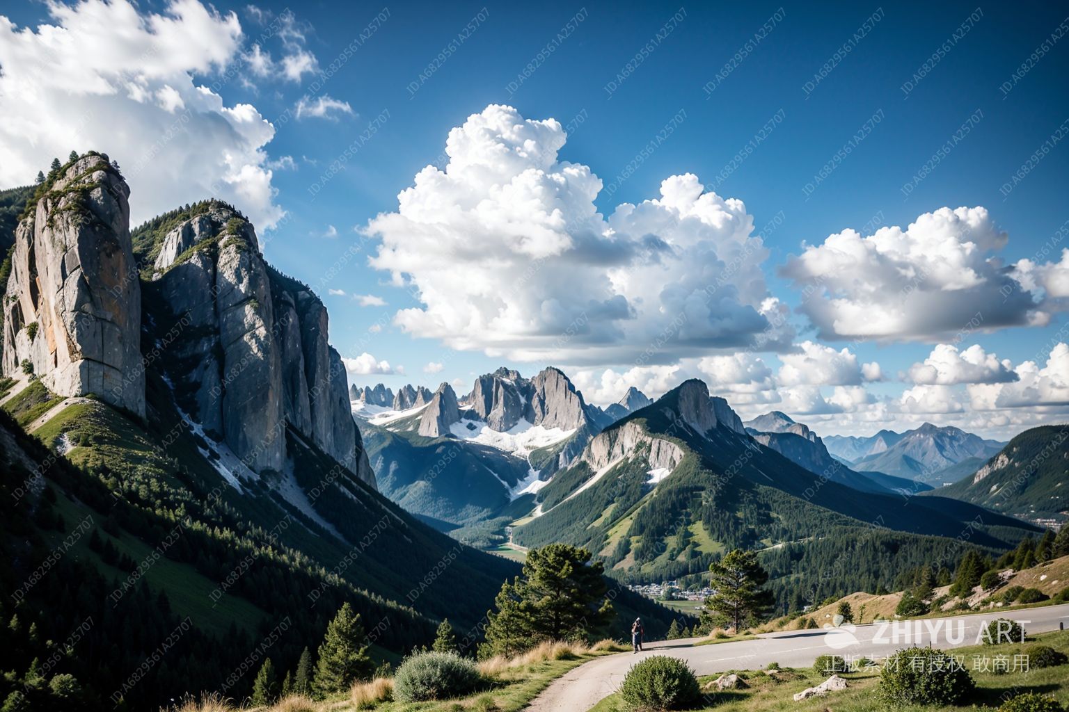 一条蜿蜒的道路被高耸的岩层包围,构成了一幅风景如画
