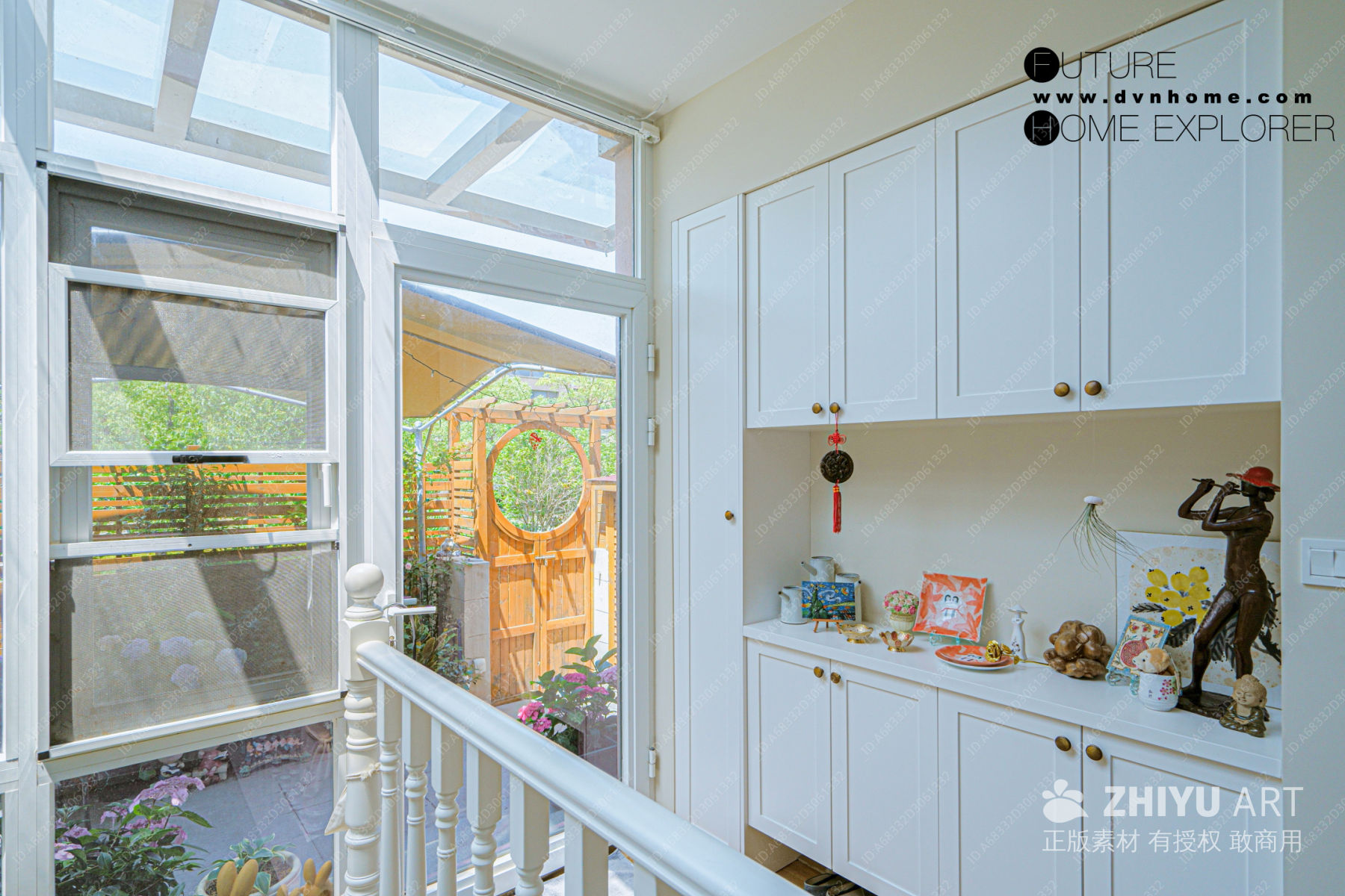 阳光明媚的白色厨房与花园