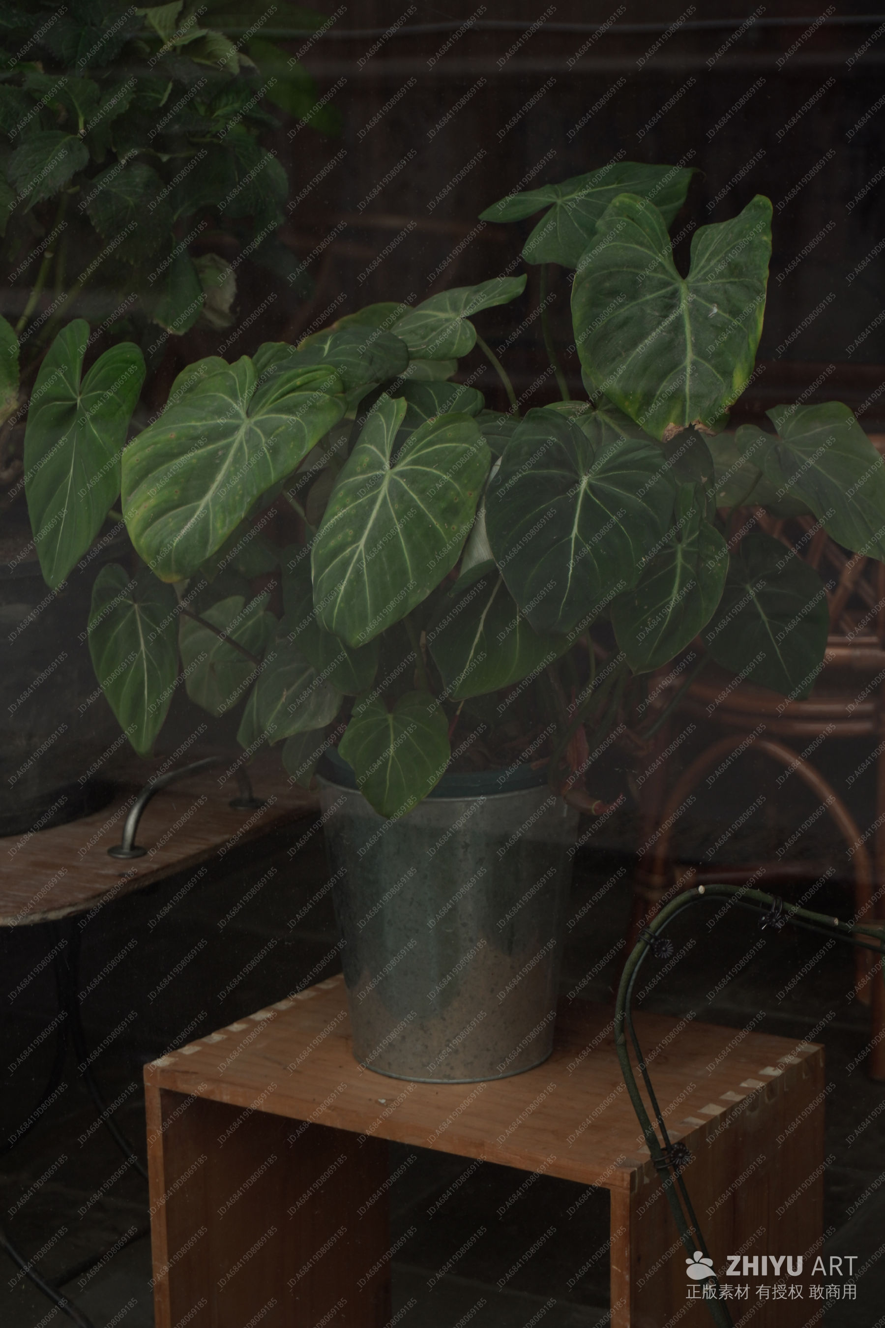自然 城市 花 植物 绿植 盆栽 室内 木质桌 金属桶 自然光 宁静 家居场景 花盆