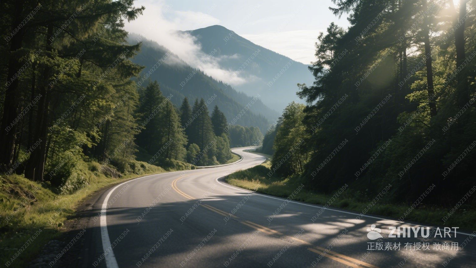 一条道路穿过茂密的绿色森林,道路两侧树木林立,营造