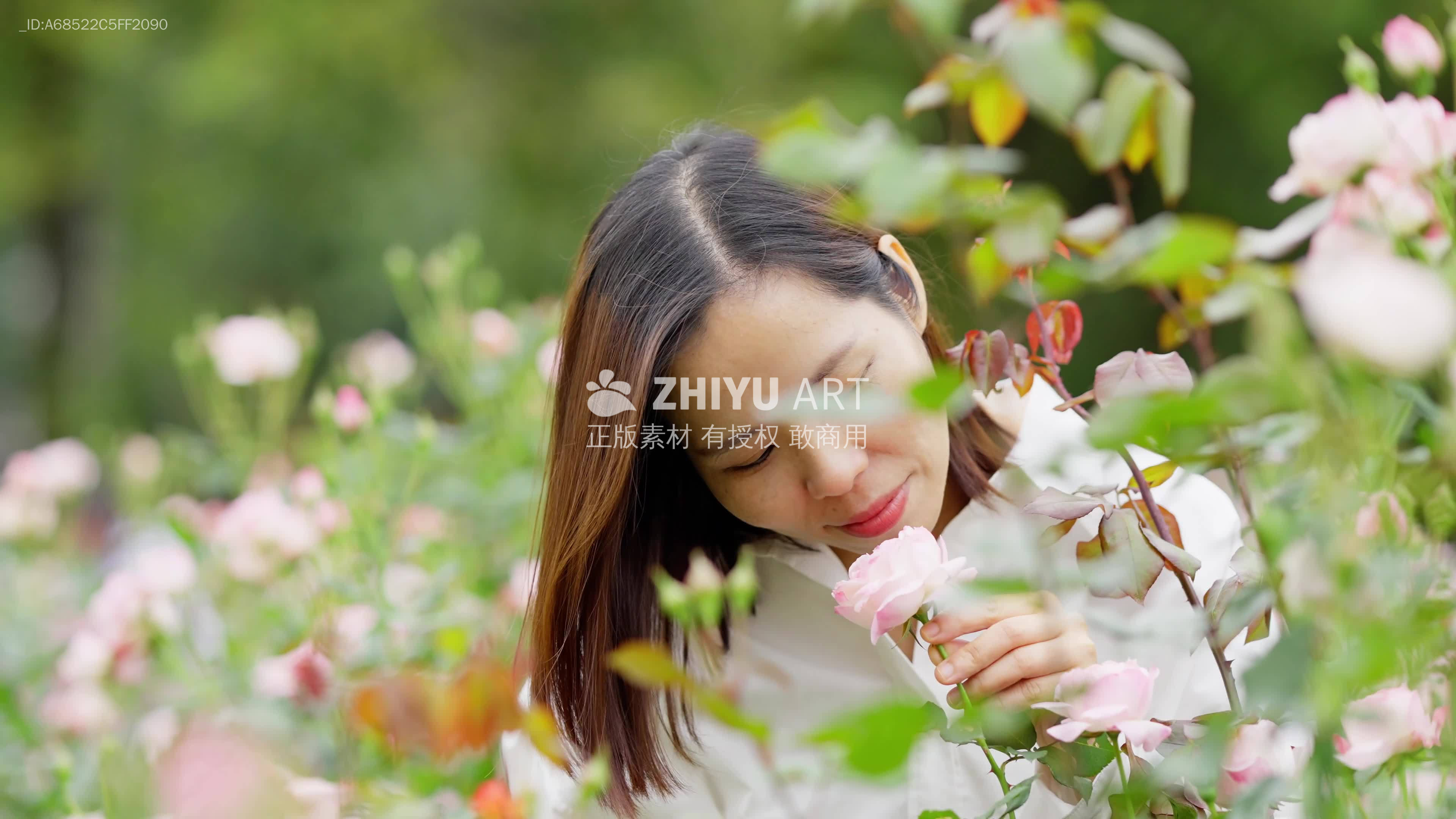 女孩低头闻花