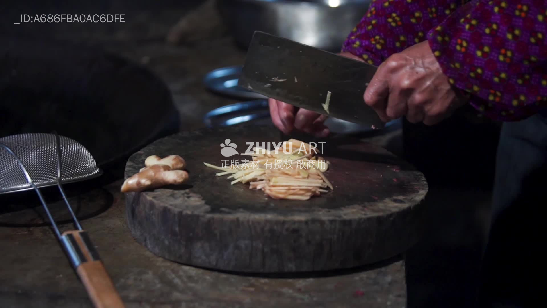 传统厨房里的切姜瞬间