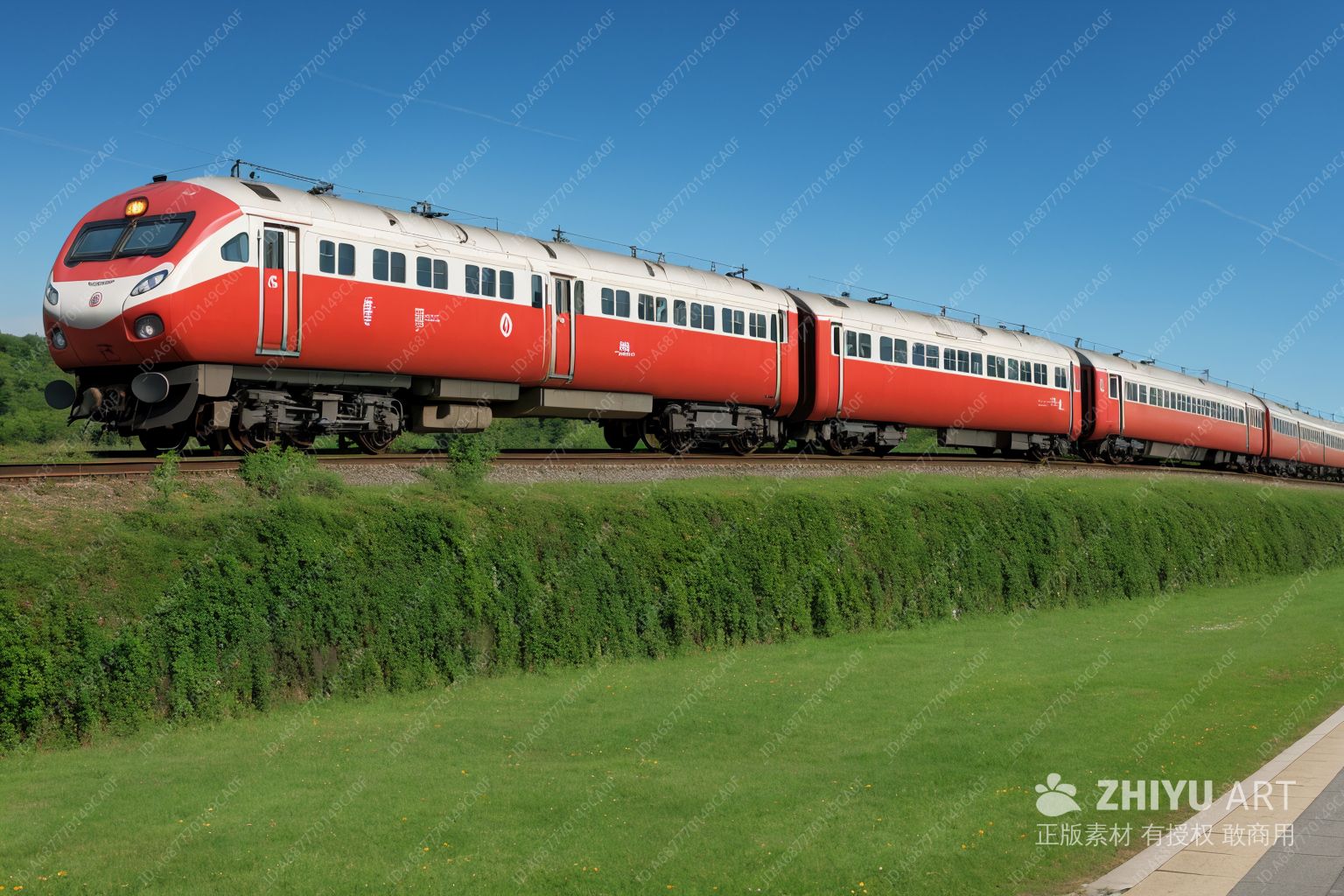 一条玩具铁路上,一列由机车和三节车厢组成的短玩具火