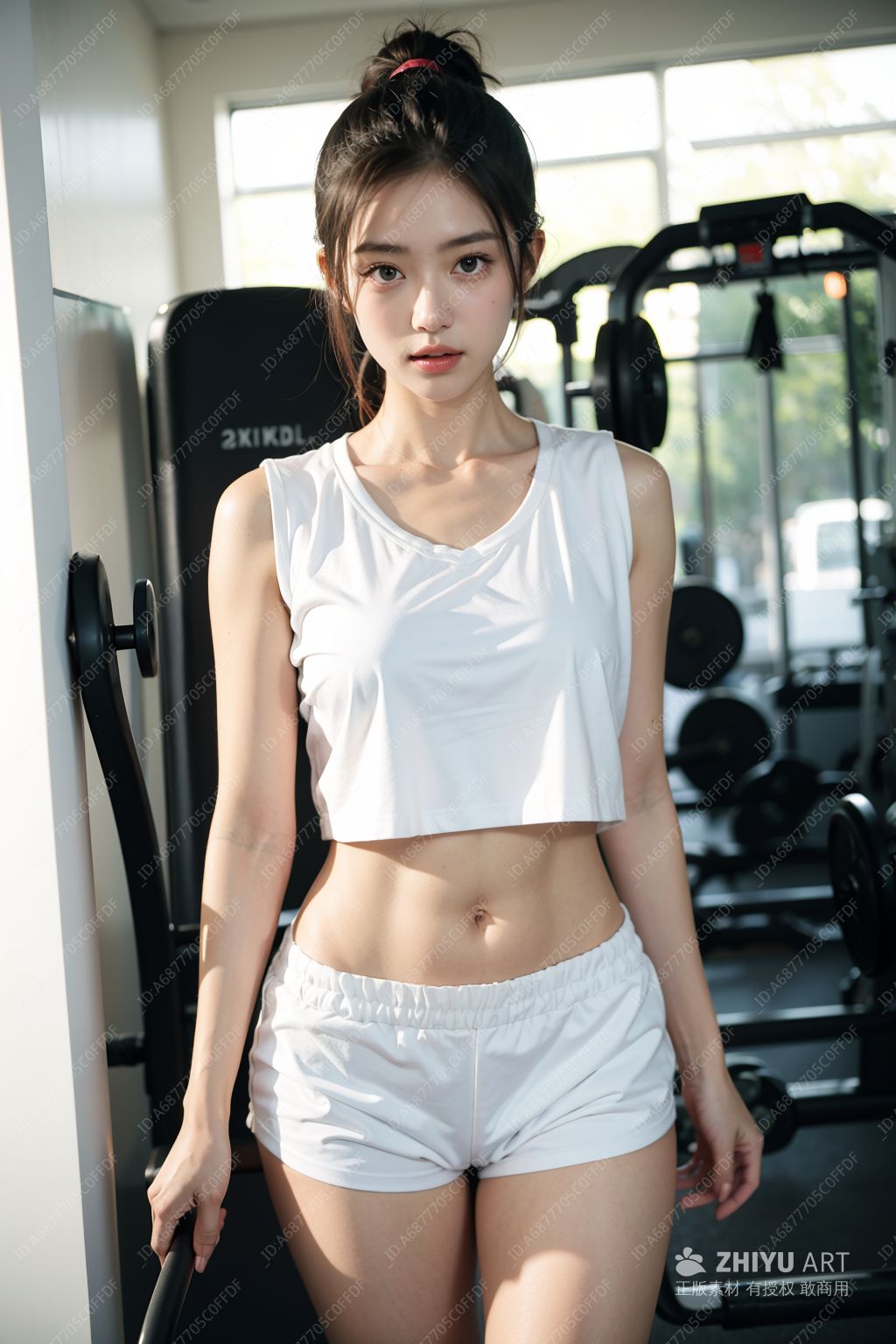 健身房内,一位身穿紧身运动裤和运动上衣的女性,做全