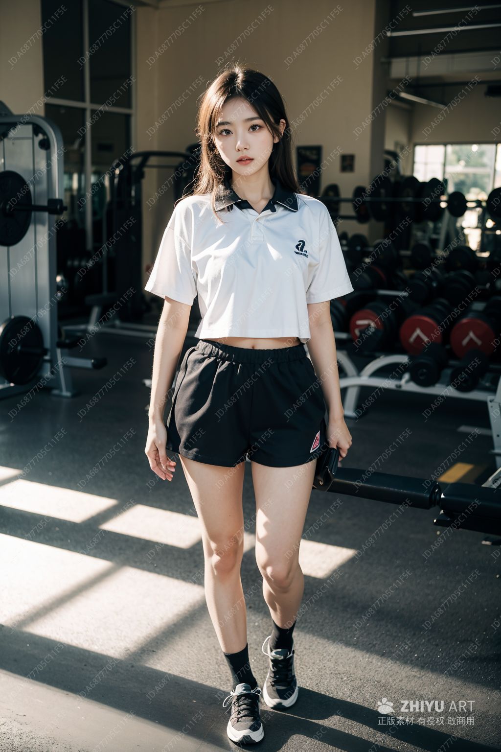 健身房内,一位身穿紧身运动裤和运动上衣的女性,做全