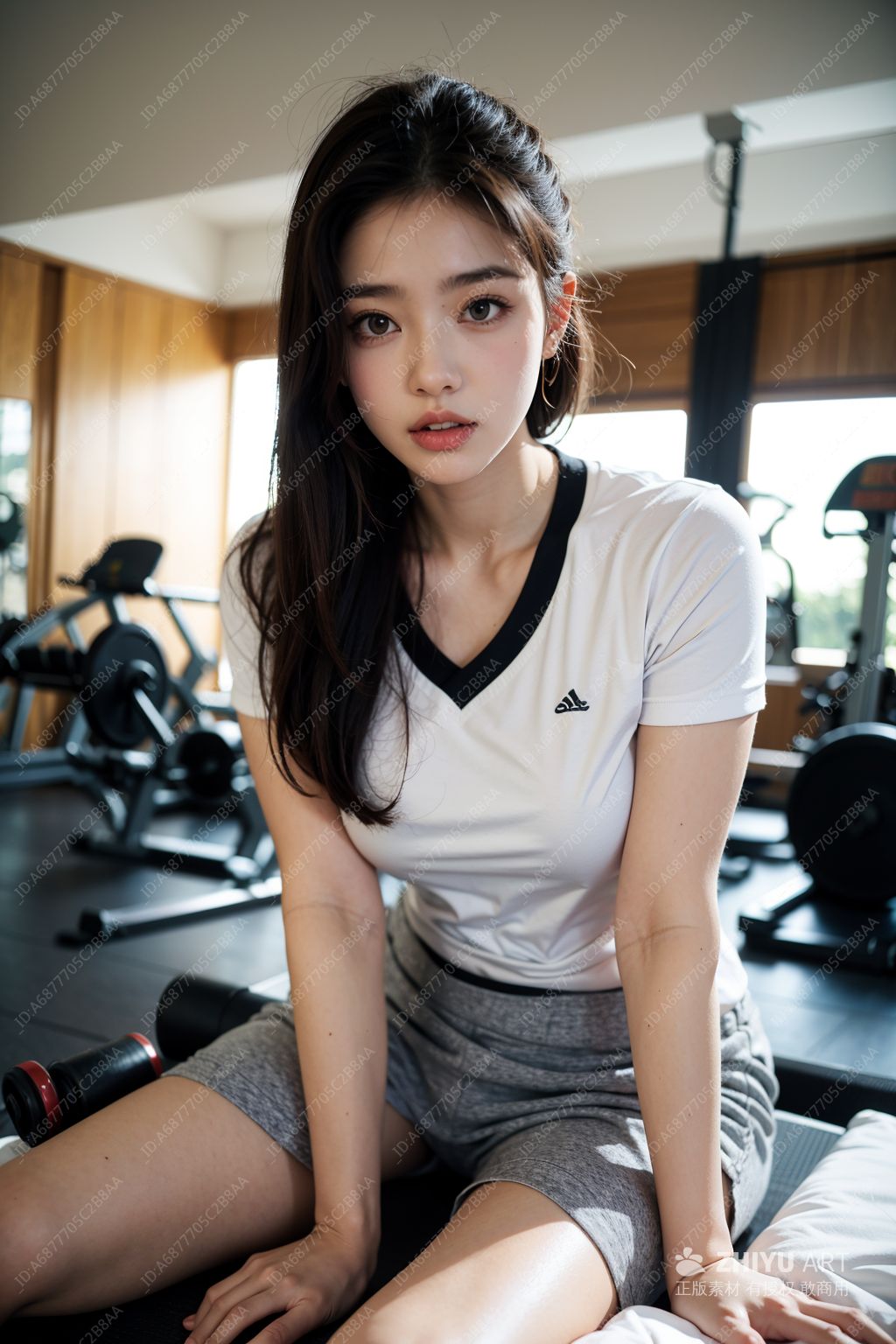 健身房内,一位身穿紧身运动裤和运动上衣的女性,做全