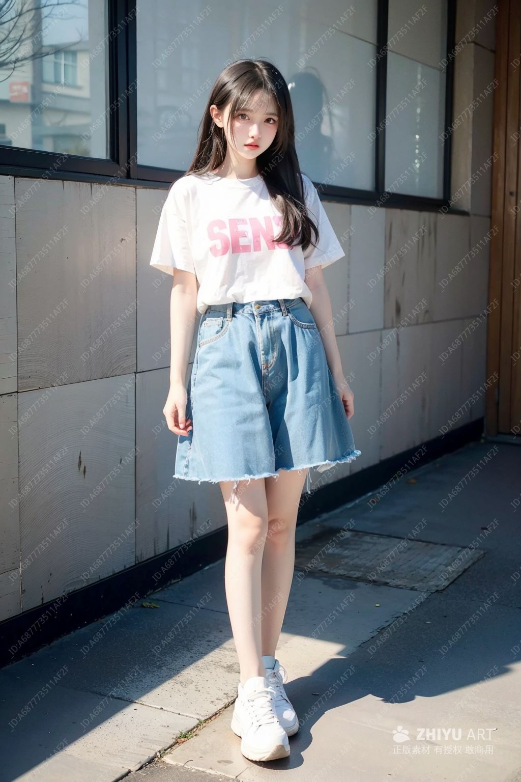 一个穿着牛仔外套和条纹T恤的女孩站在一片开满野花的