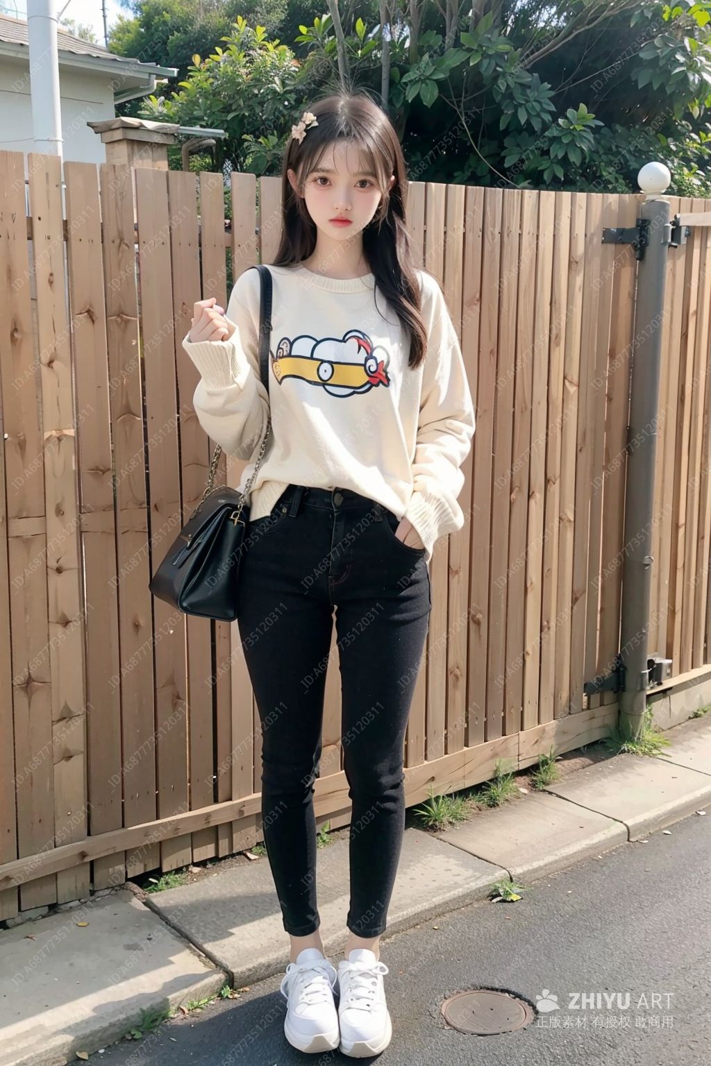 一个年轻的少女蹲在长满草的区域里,背景是树木。她穿