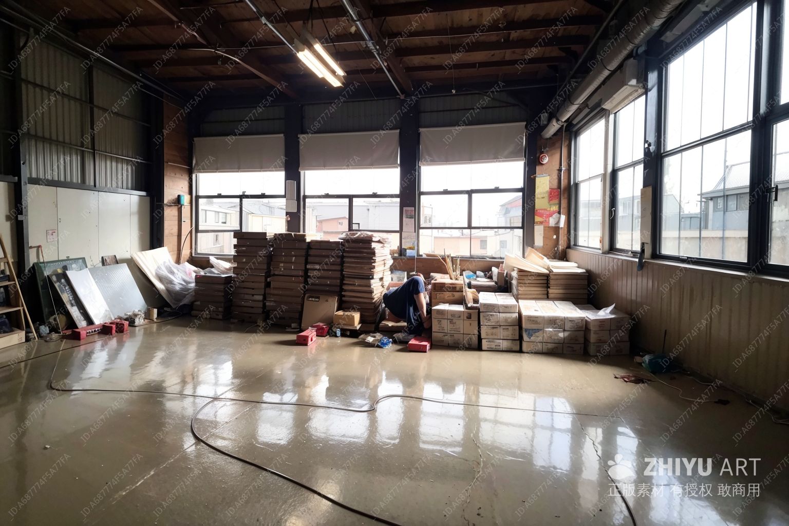 仓库内部,堆叠着大量包装好的板材,板材被米色带子捆