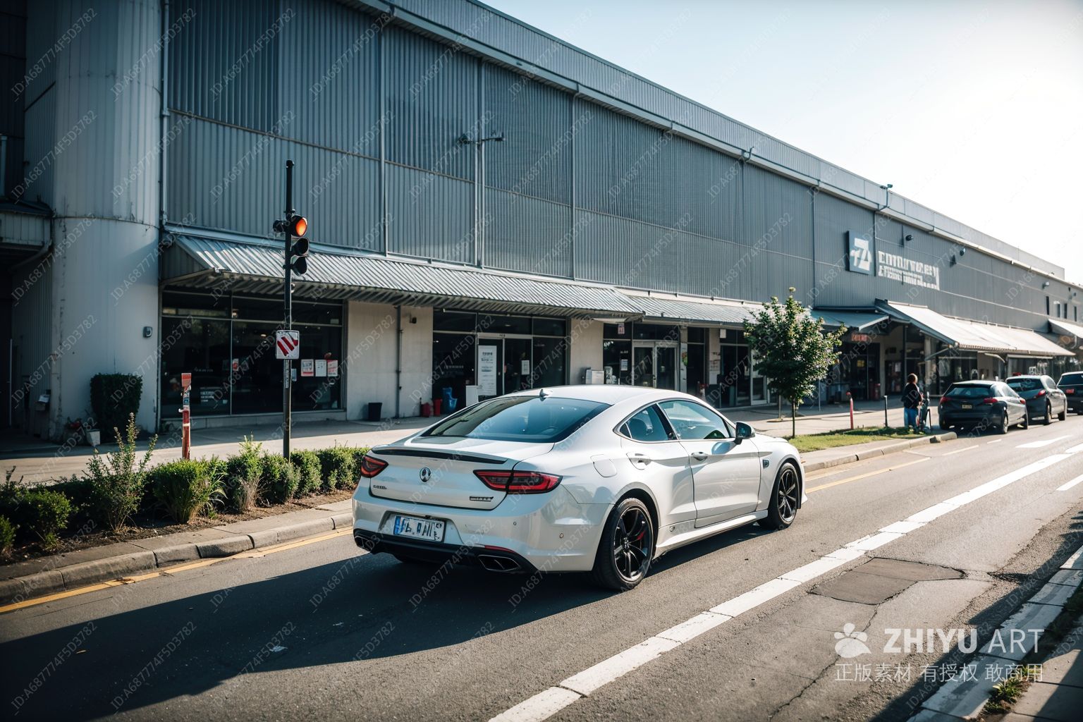 一辆银色汽车停在城市街道上,车头前方有一个写着“W