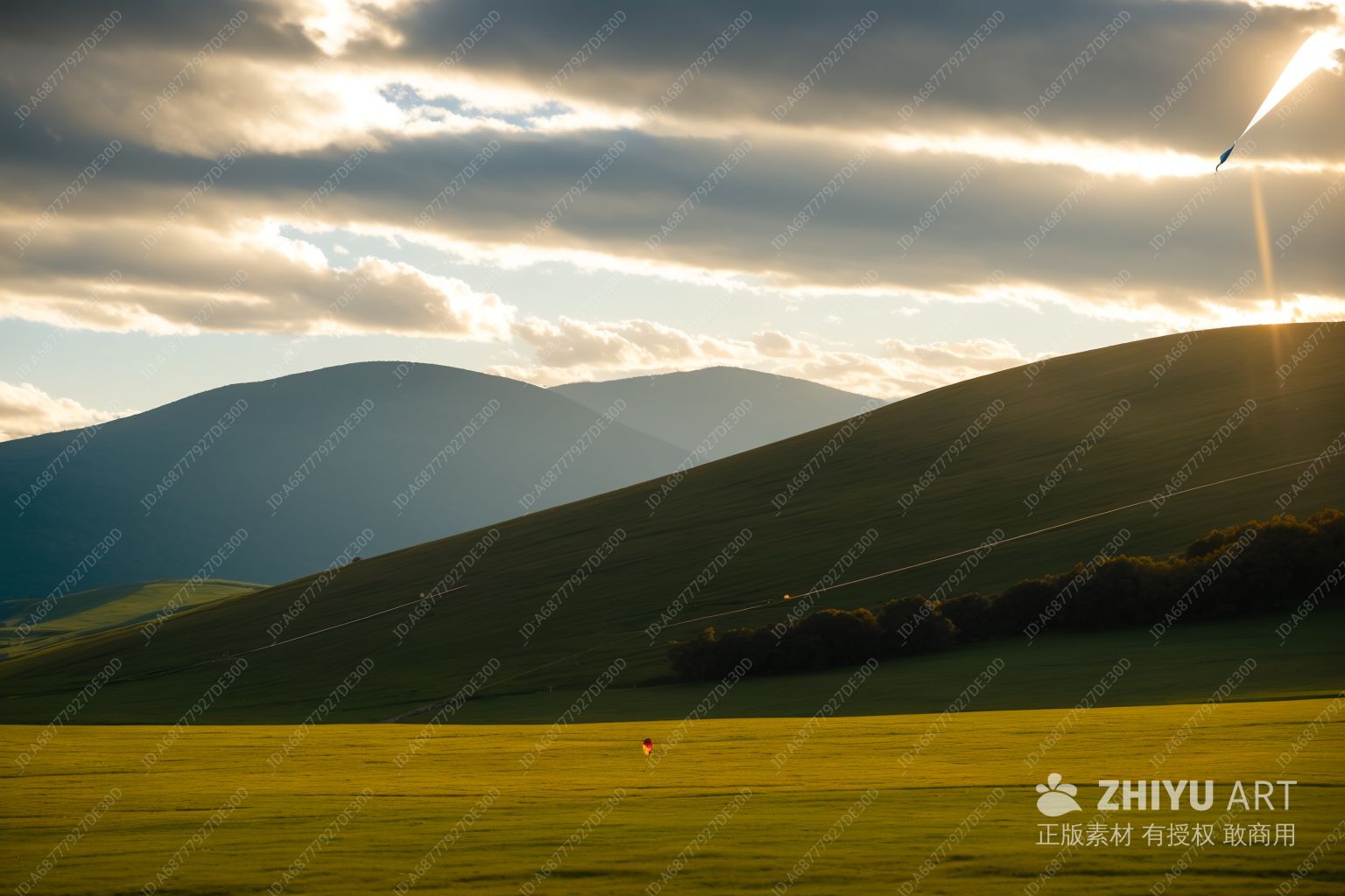 广阔的绿色田野占据了前景,上面点缀着干草堆。背景是