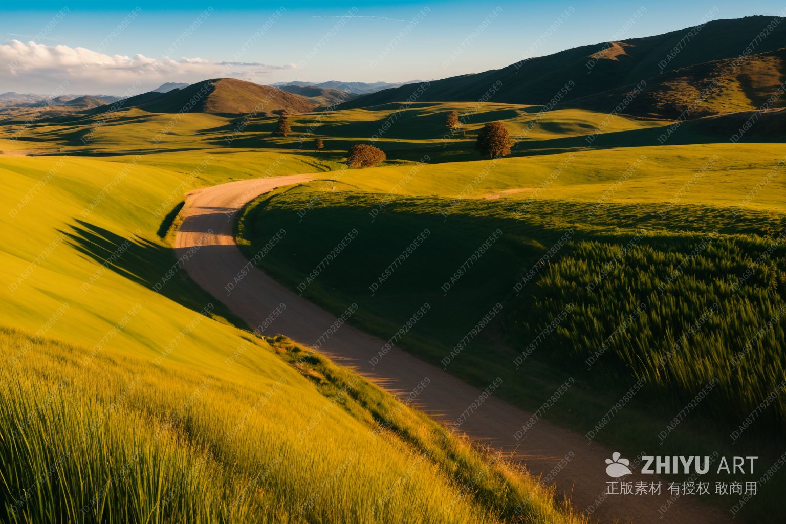 一片翠绿的田野映入眼帘,上方是多云的蓝色天空。田野