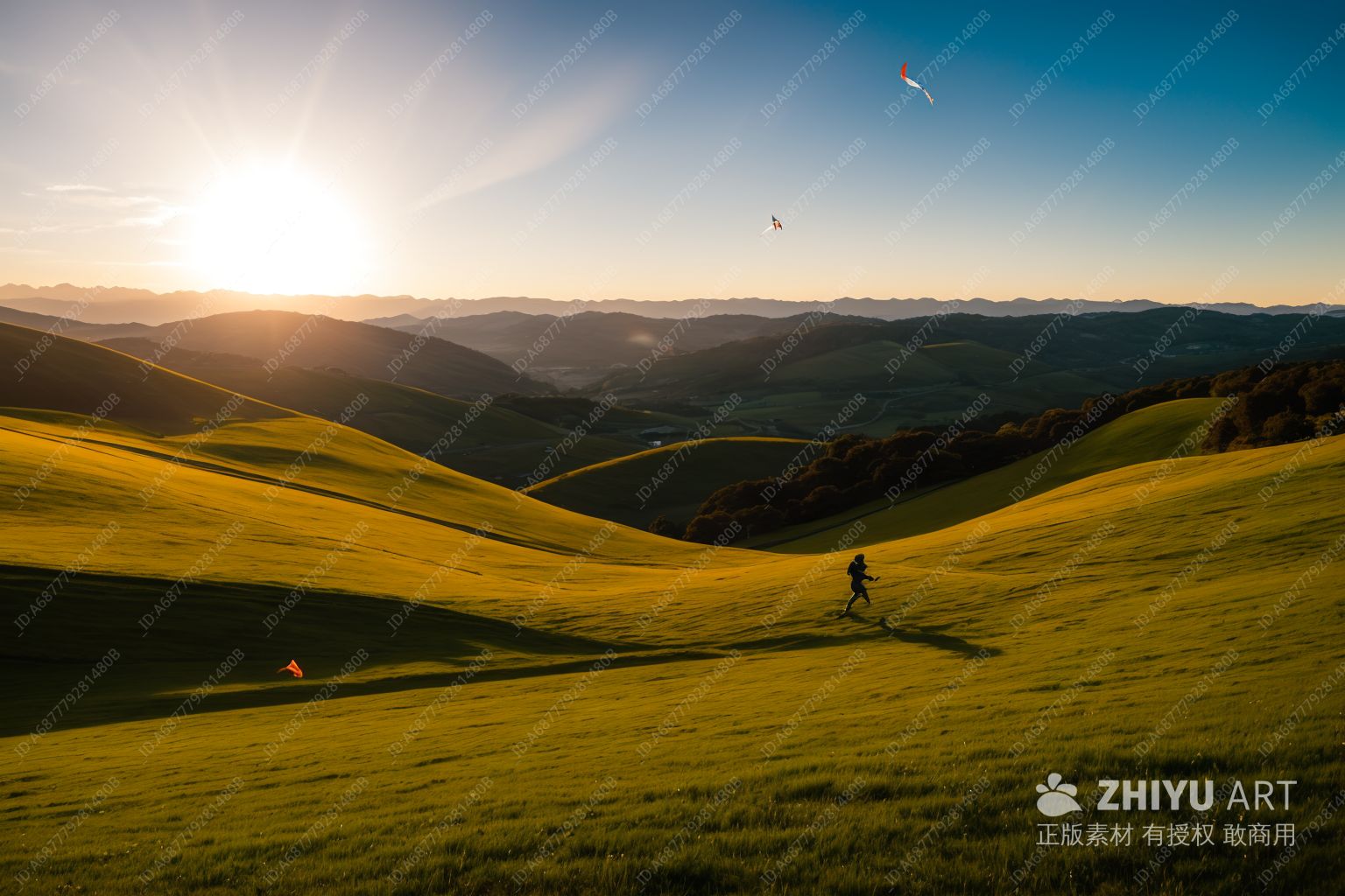 天空呈现出绚丽的橙色日落,温暖的光芒洒在地面上。天