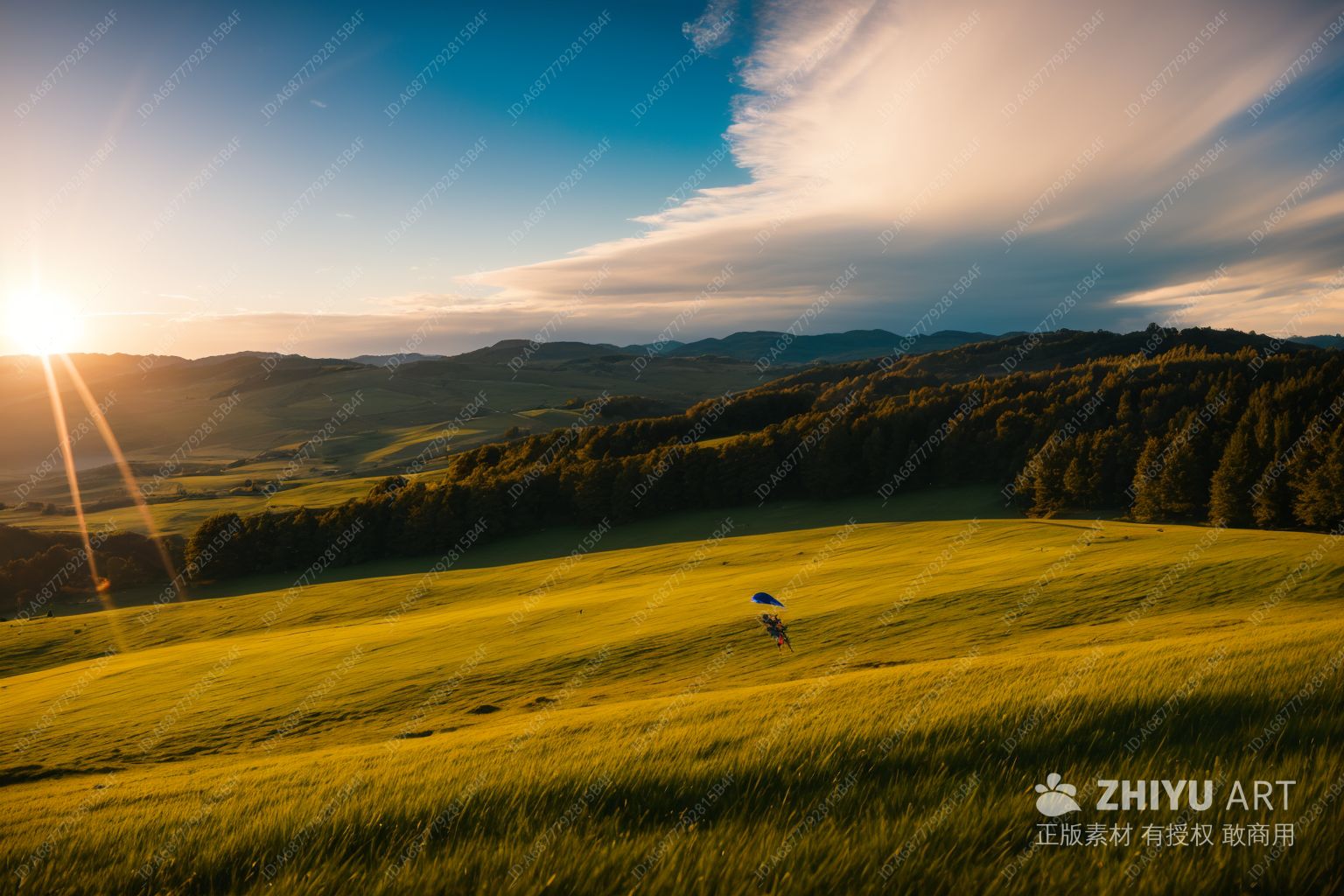 太阳在丘陵地带的天空中,光芒四射。连绵起伏的绿色山