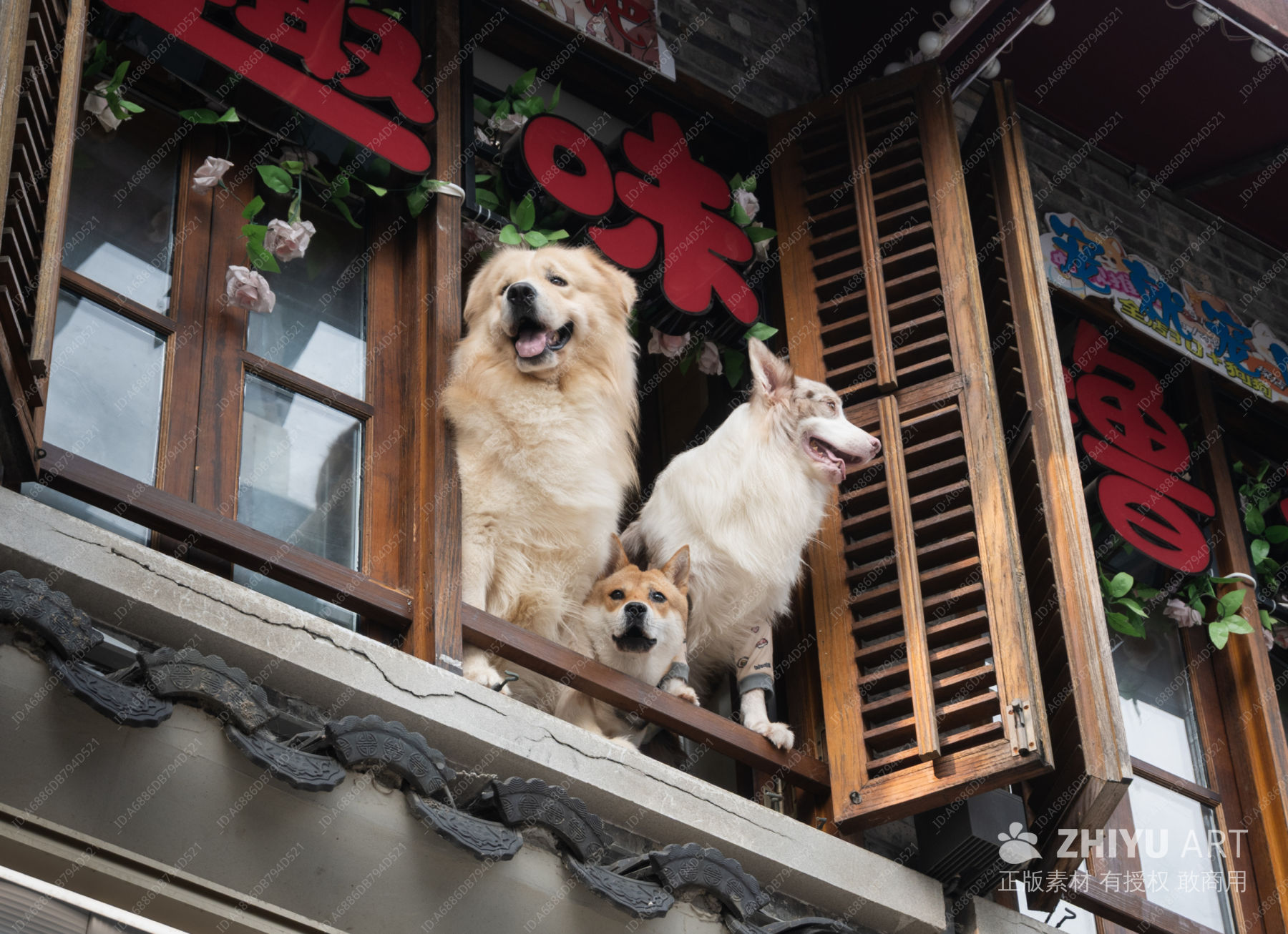 狗狗们在传统建筑的阳台上微笑