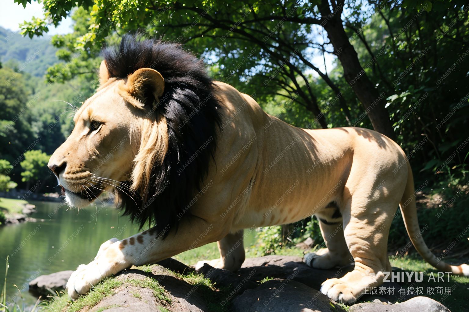 一只卡通风格的狮子站在岩石上,背景是树木和植物。狮