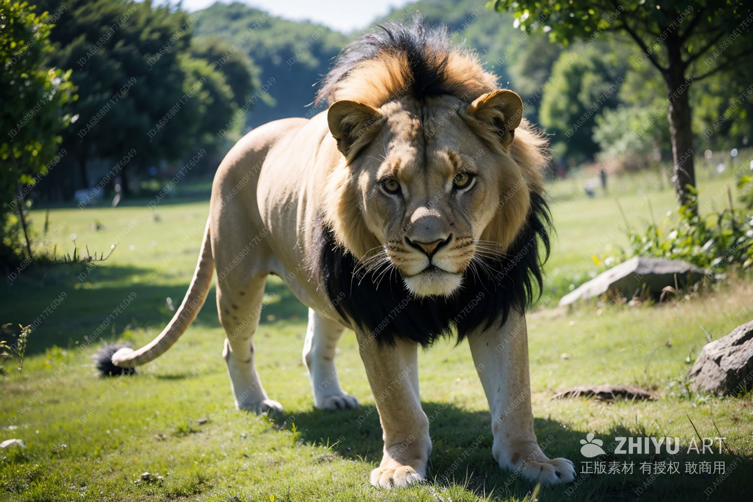一只雄狮正朝向画面走来,它拥有蓬松且发光的鬃毛,眼